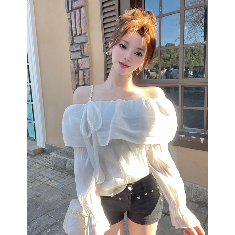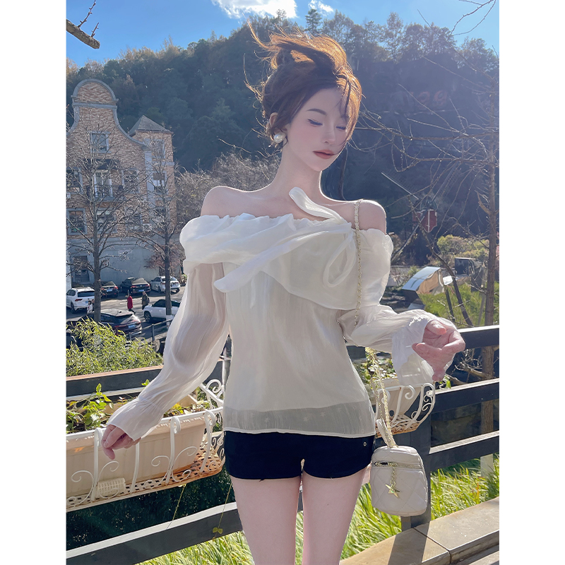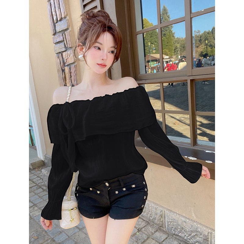 FA56294# 甜美气质一字肩荷叶领光泽感衬衫法式绑带蝴蝶结绝美露肩上衣 服裝批發女裝批發服飾貨源