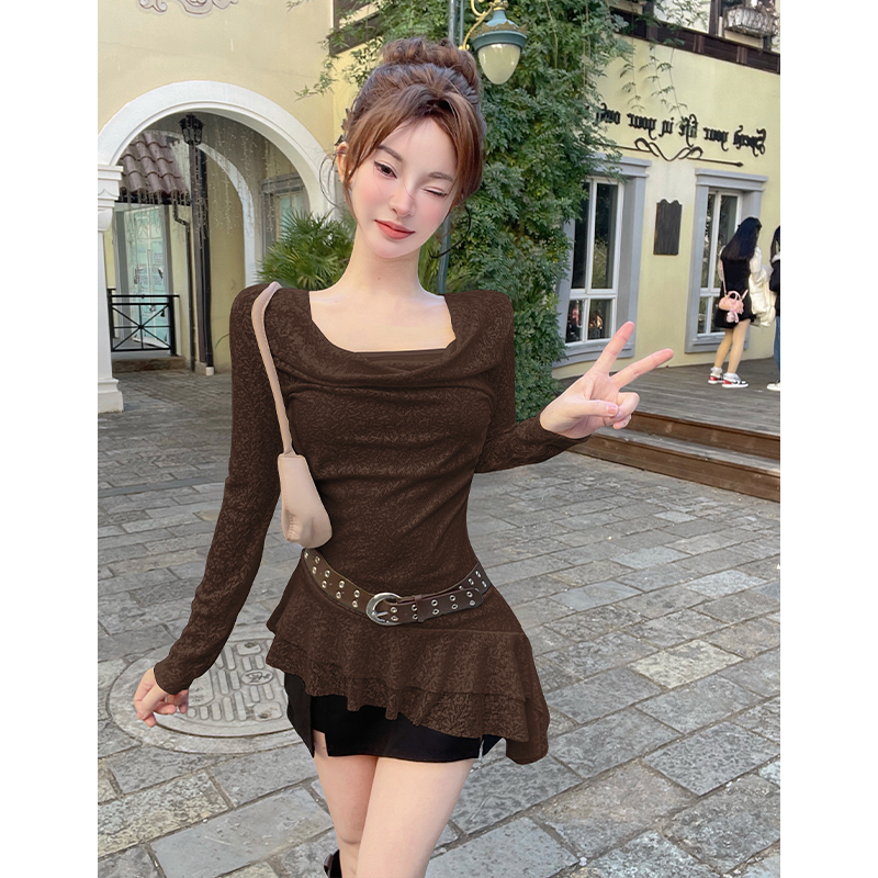 FA56297# 废式风荡领蕾丝长袖T恤女早春不规则荷叶边掐腰法式绝美上衣 服裝批發女裝批發服飾貨源