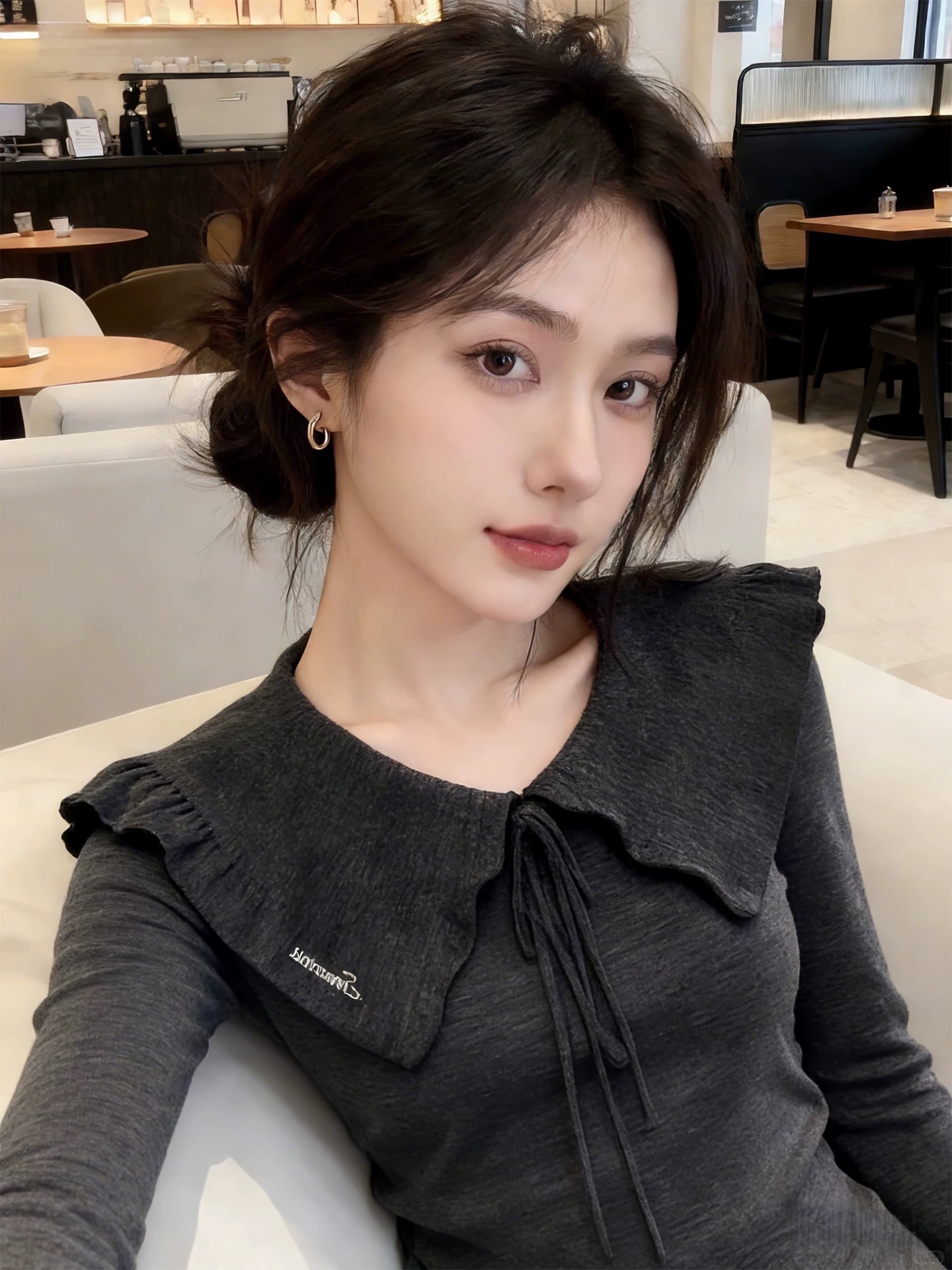 BY10645# 灰色v型翻领蝴蝶结系带修身长袖T恤内搭打底衫女春季韩系穿搭上衣 服裝批發女裝批發服飾貨源