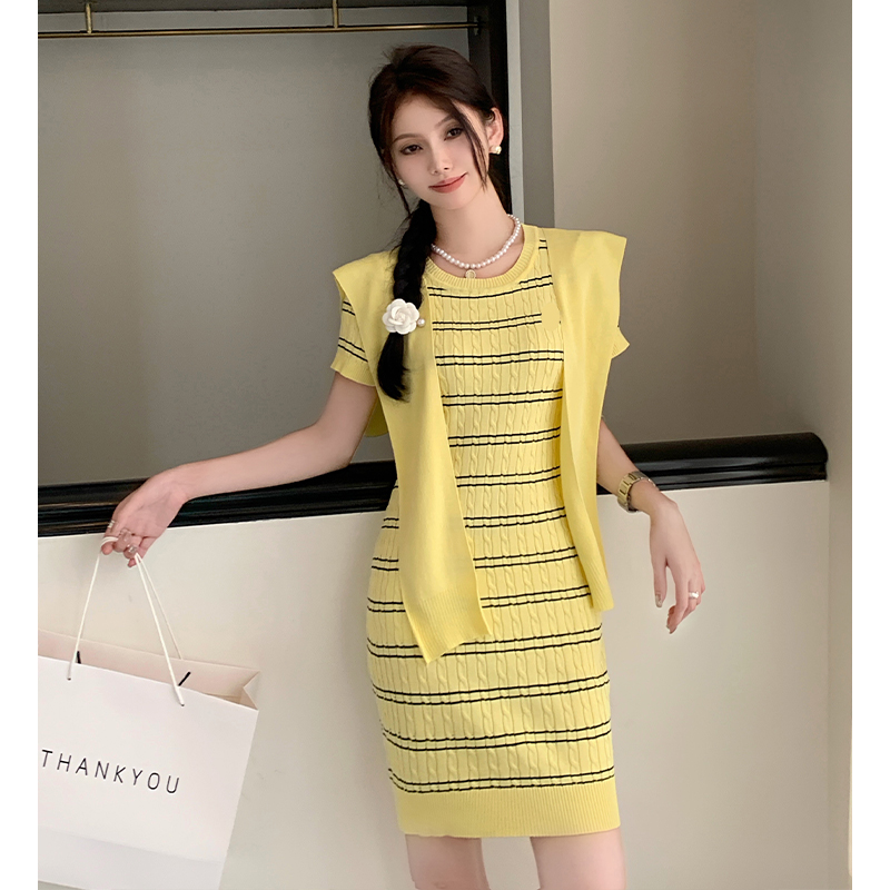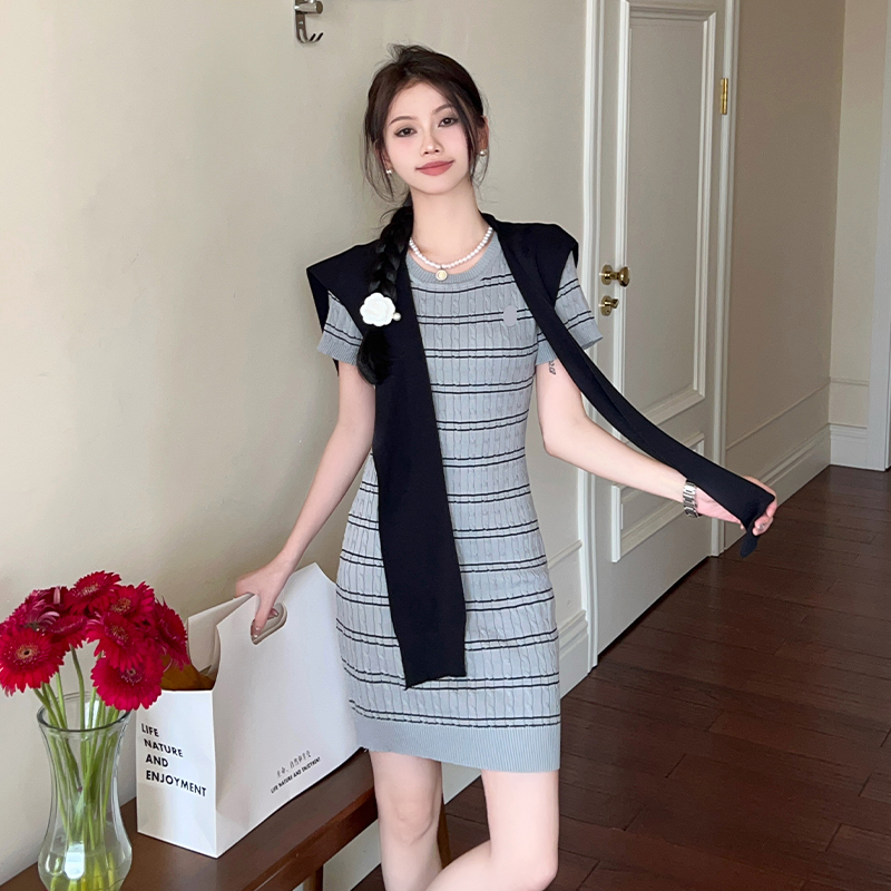 BY10935# 纯欲性感针织短袖连衣裙夏修身显瘦条纹包臀短裙披肩套装 服裝批發女裝批發服飾貨源