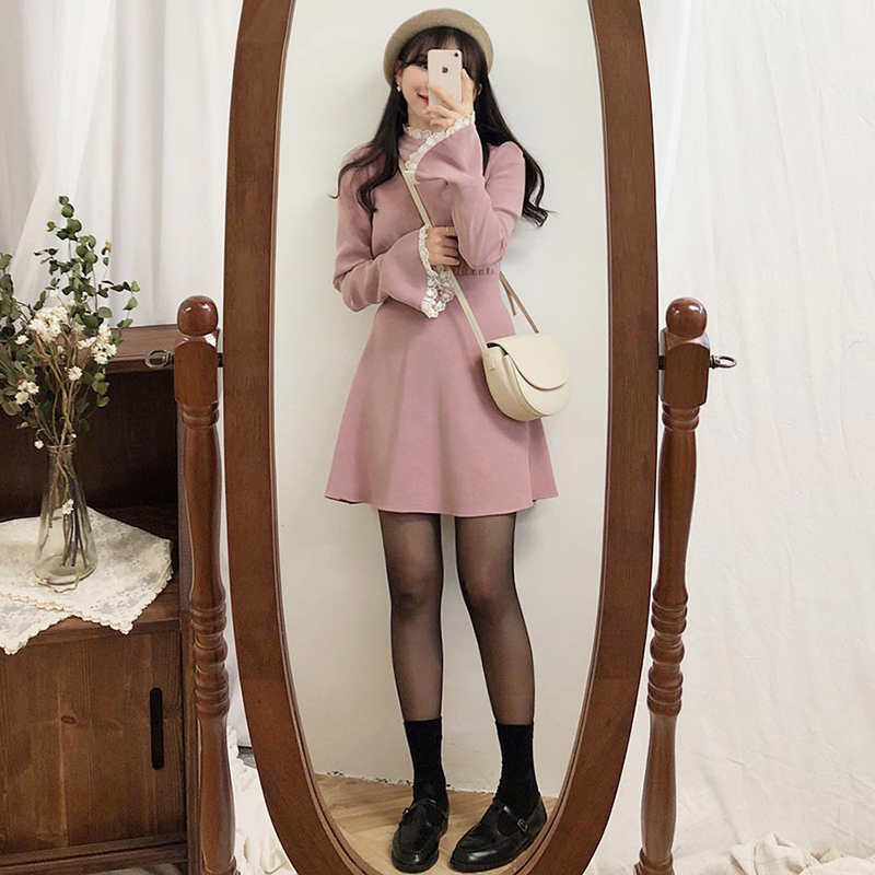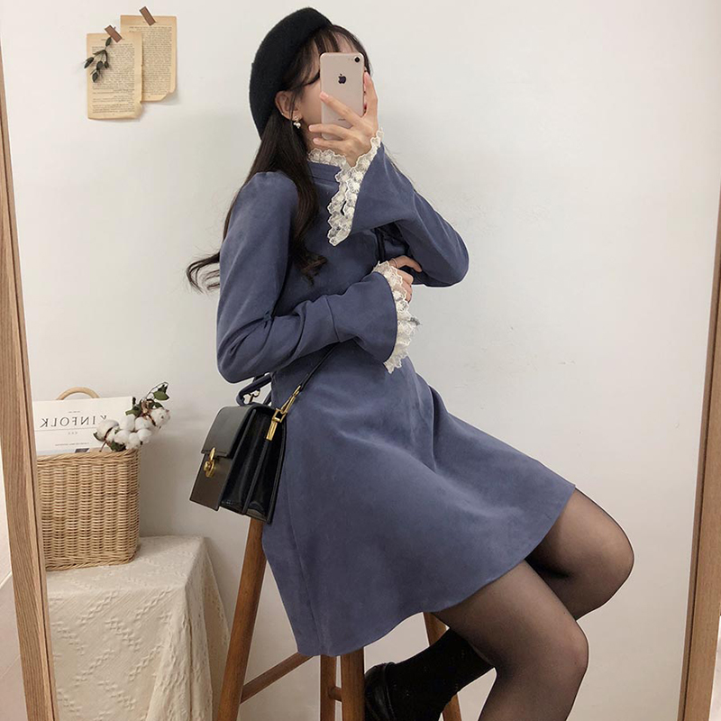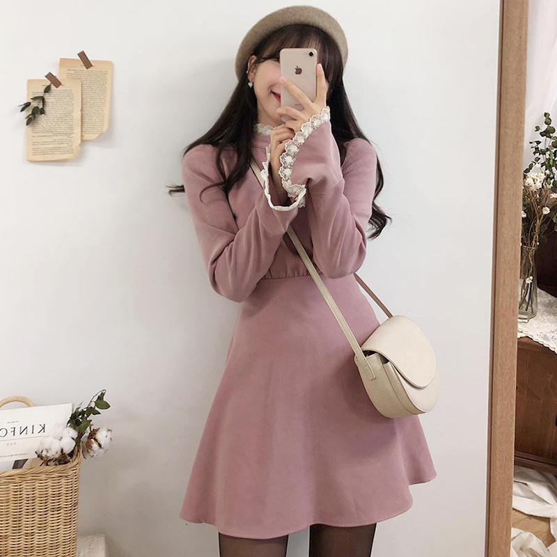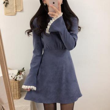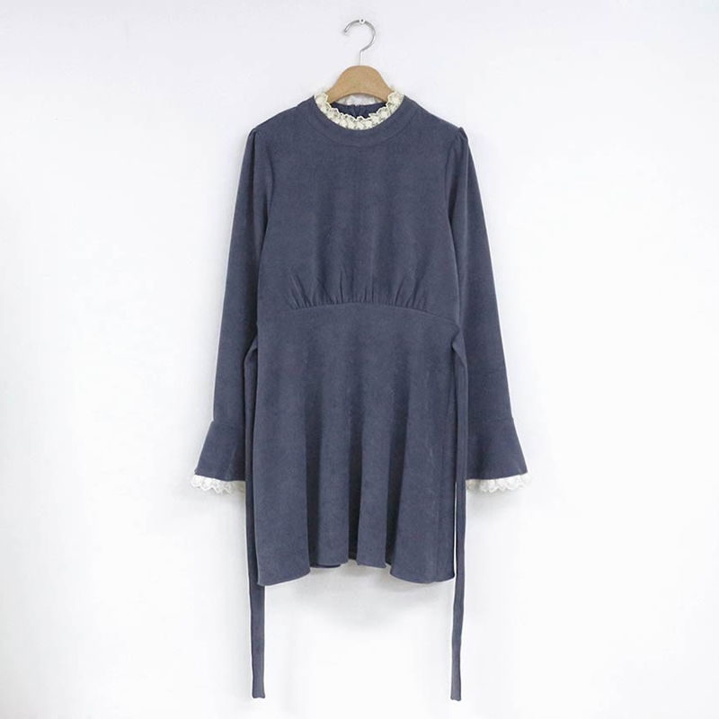 春秋小众连衣裙流行纯色花边连衣裙 服裝批發女裝批發服飾貨源