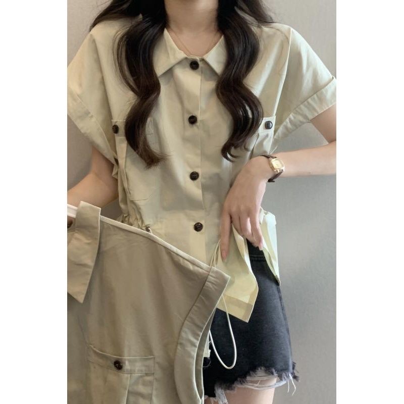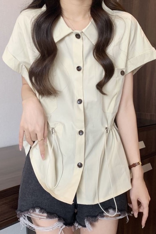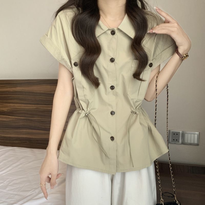 设计感工装短袖衬衫女夏季薄款大码胖mm收腰显瘦盐系休闲抽绳上衣 服裝批發女裝批發服飾貨源