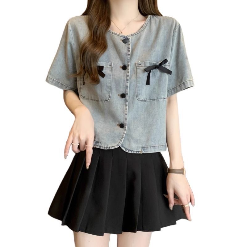 开春新款女款法式蝴蝶结短袖牛仔衬衫时尚潮流设计感短款上衣 服裝批發女裝批發服飾貨源