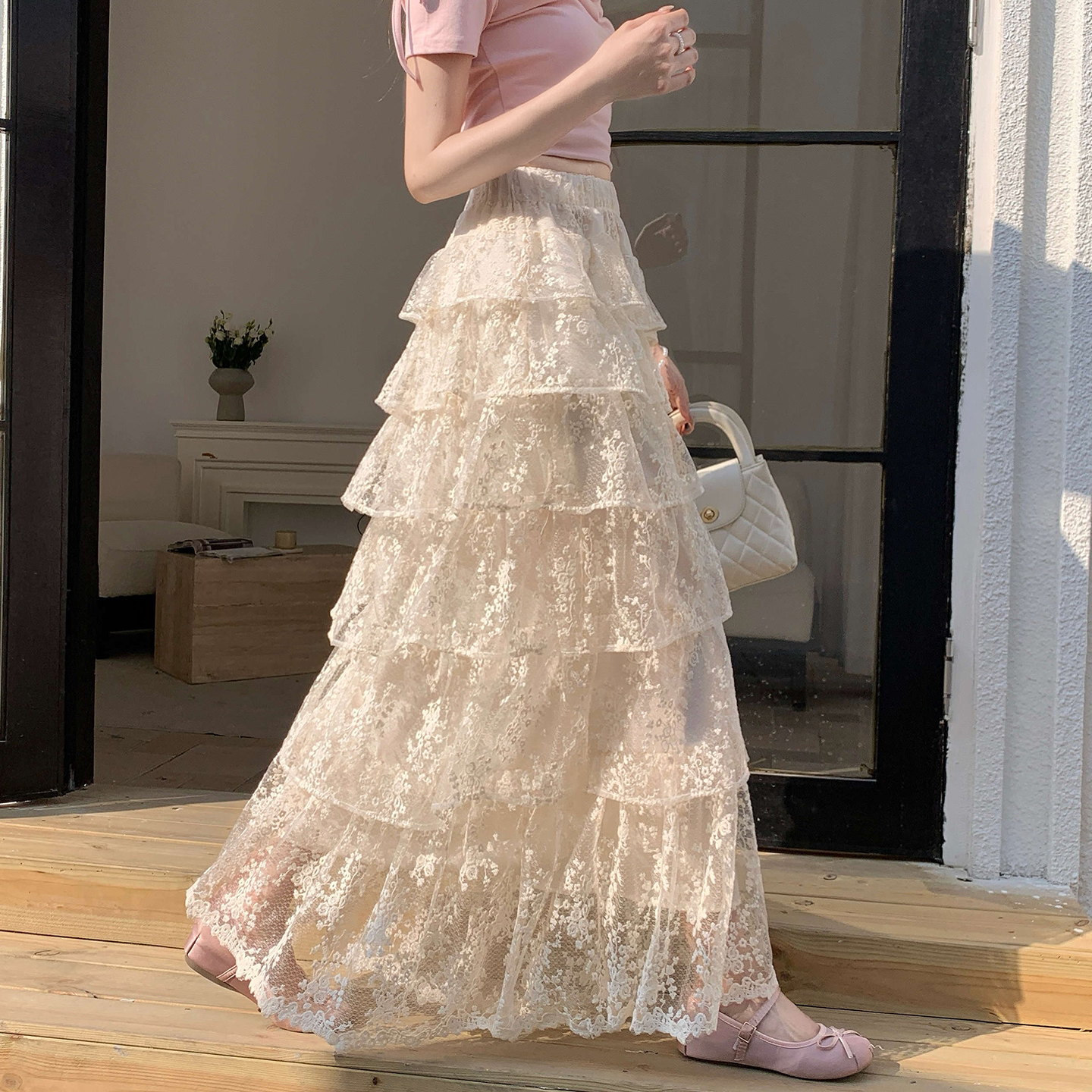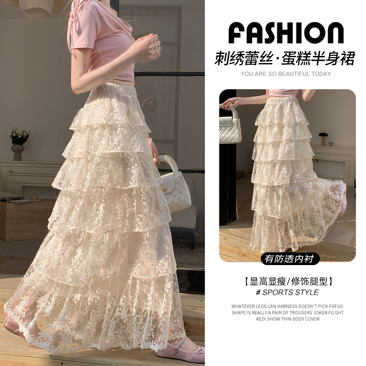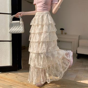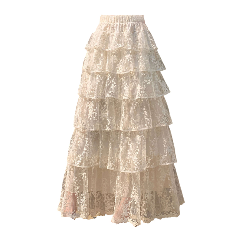 仙气感温柔蕾丝半身裙春夏新款a字高腰蓬蓬蛋糕裙松紧腰长款裙子 服裝批發女裝批發服飾貨源