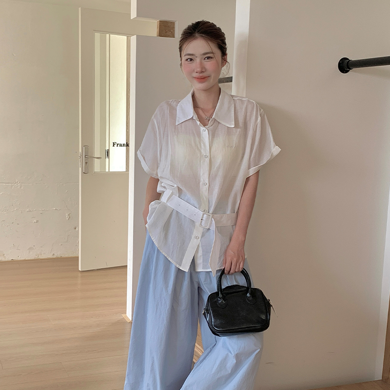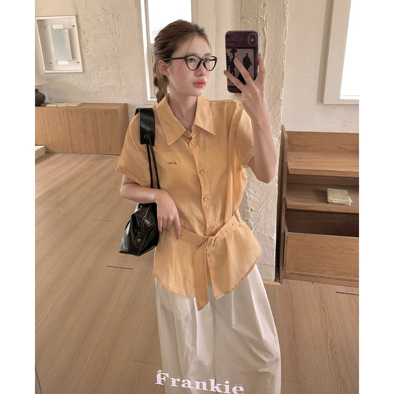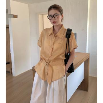 天丝苎麻韩版刺绣显瘦腰带系带短袖衬衫设计感小众上衣 服裝批發女裝批發服飾貨源