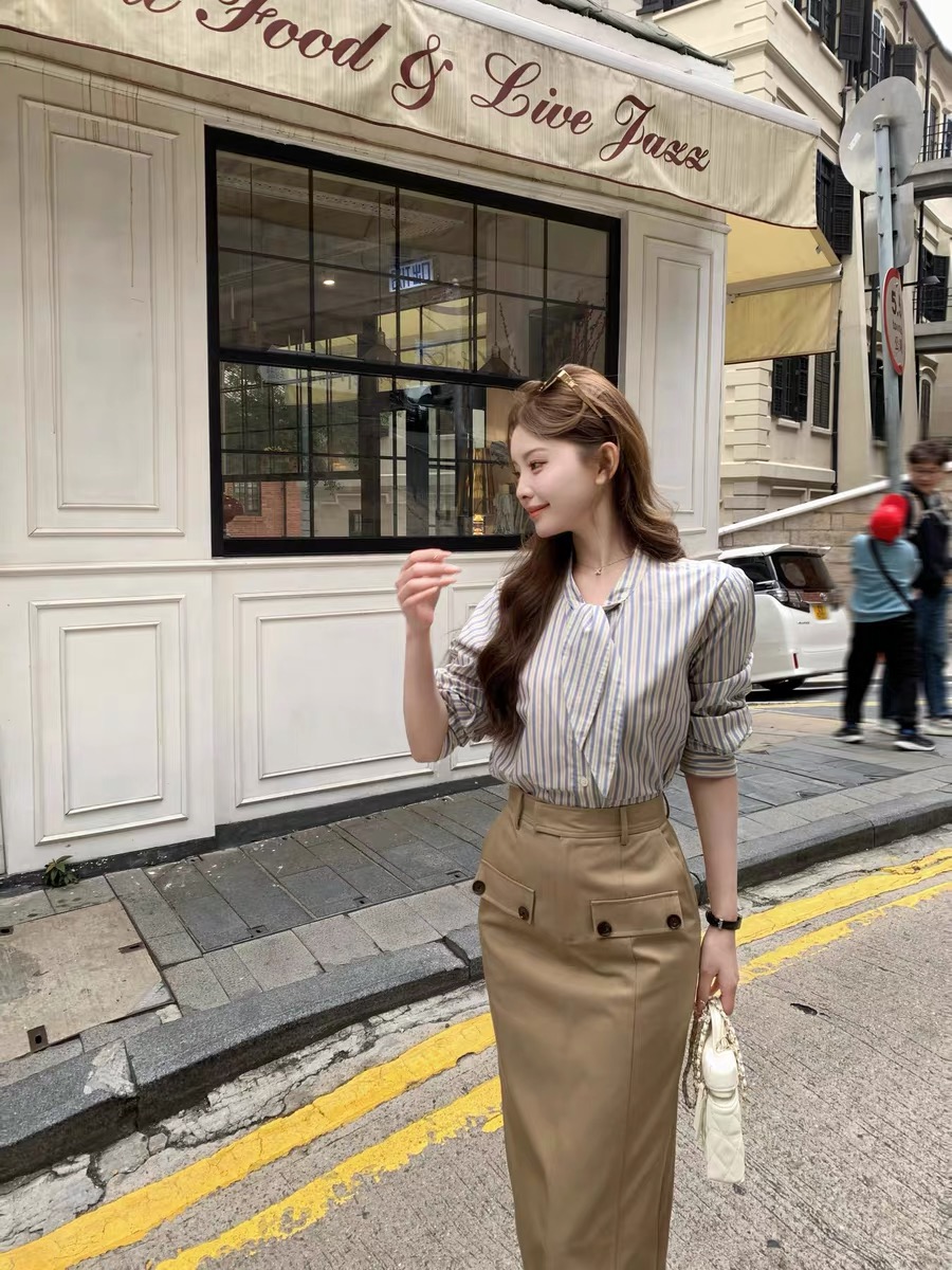 春季新款韩系气质通勤系带显瘦长袖衬衫+半裙 服裝批發女裝批發服飾貨源