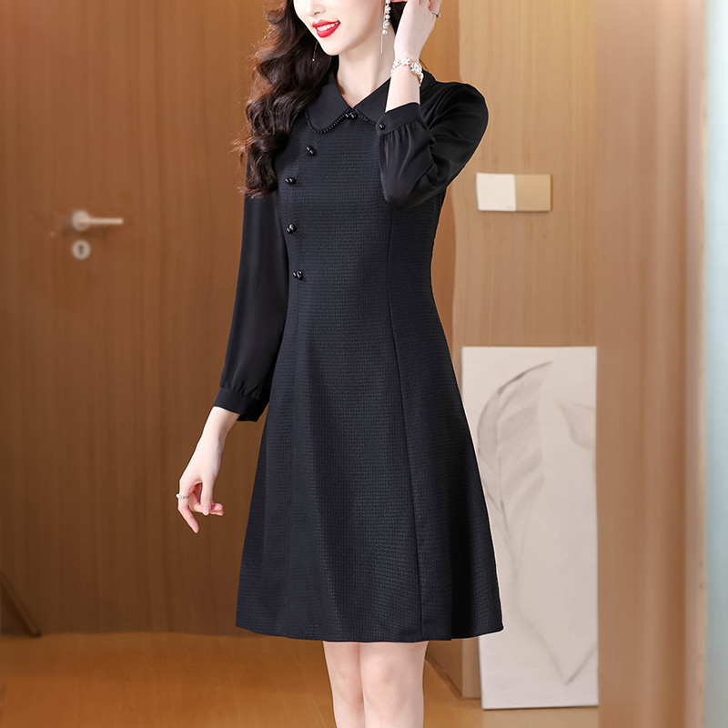 娃娃领黑色连衣裙女秋装新款女装长袖收腰显瘦赫本小黑裙子 服裝批發女裝批發服飾貨源