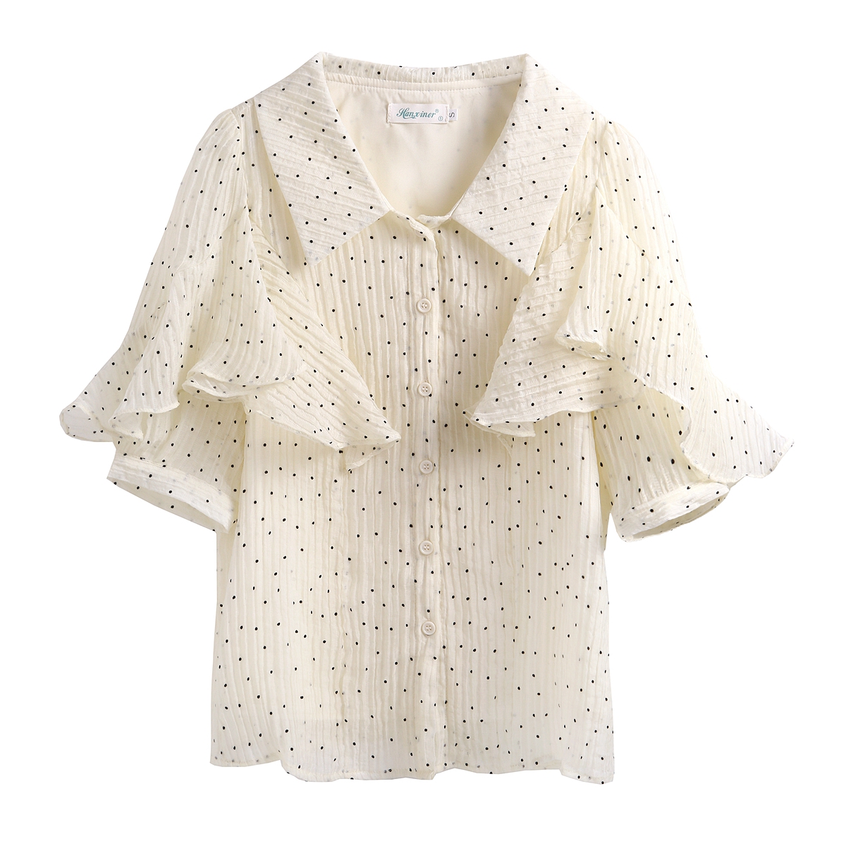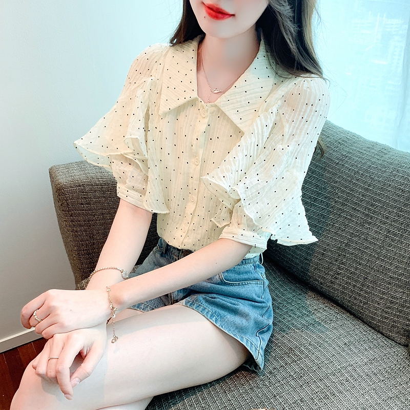 雪纺短袖衬衫女夏新款法式波点上衣设计感小众翻领荷叶袖衬衣 服裝批發女裝批發服飾貨源