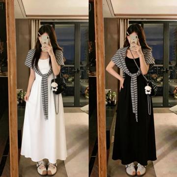 条纹披肩+白色连衣裙