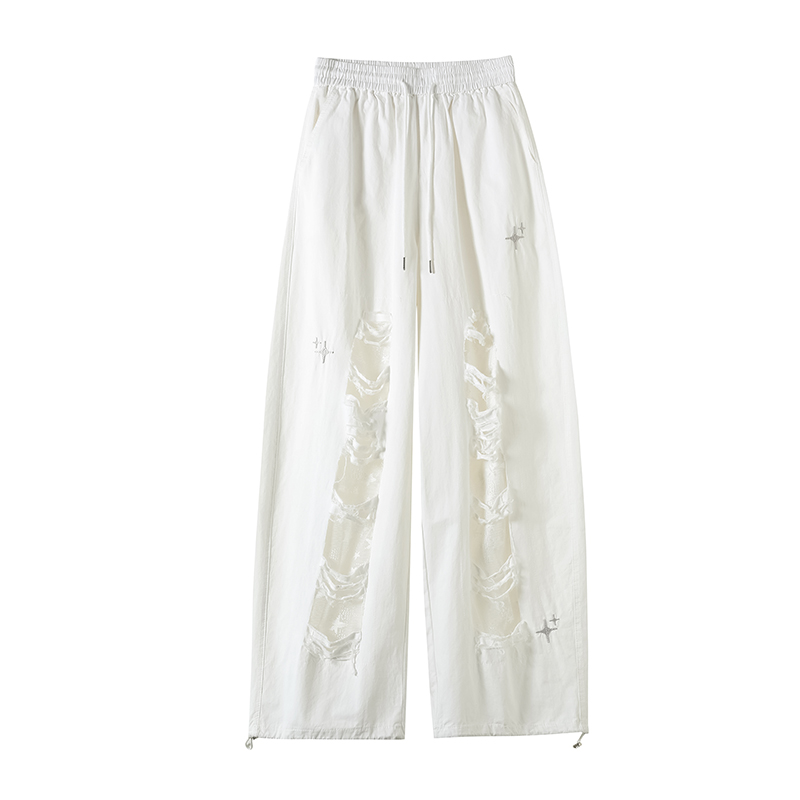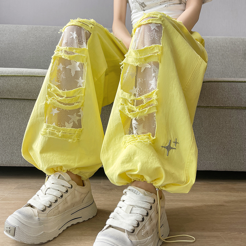 BY12407# 春夏全棉洗水美式拼接镂空蕾丝个性破洞时尚显瘦休闲裤弯刀裤 服裝批發女裝批發服飾貨源
