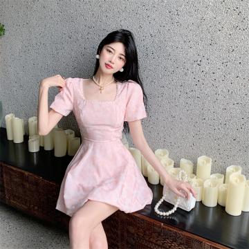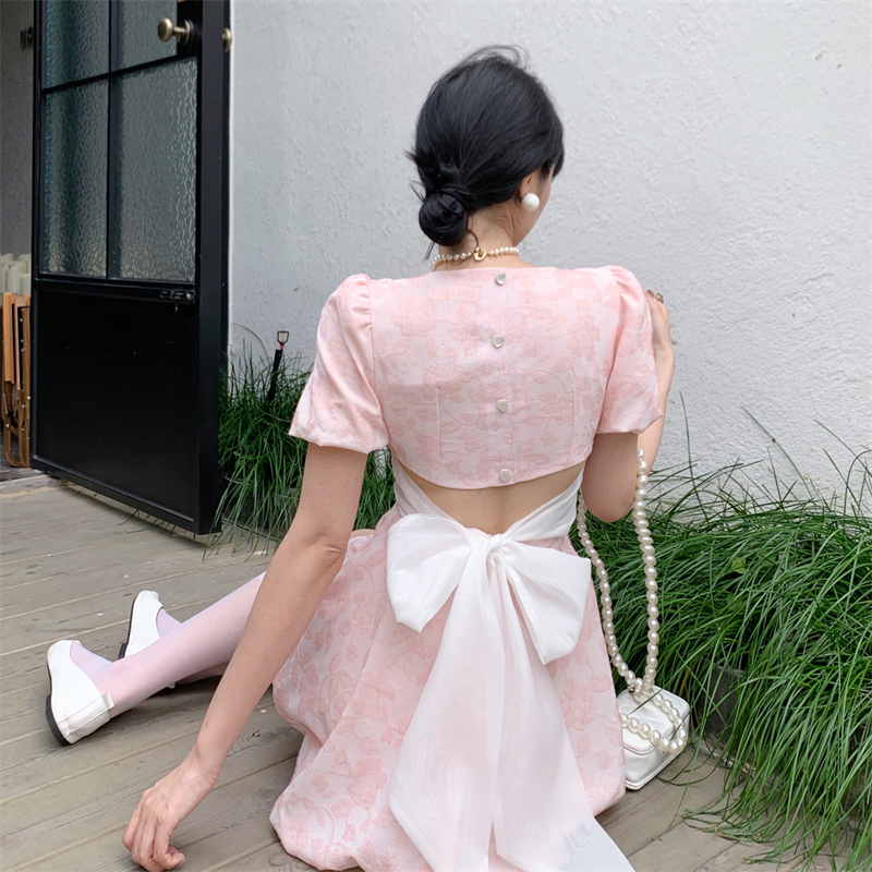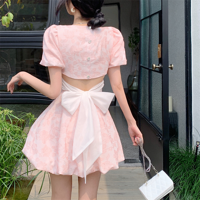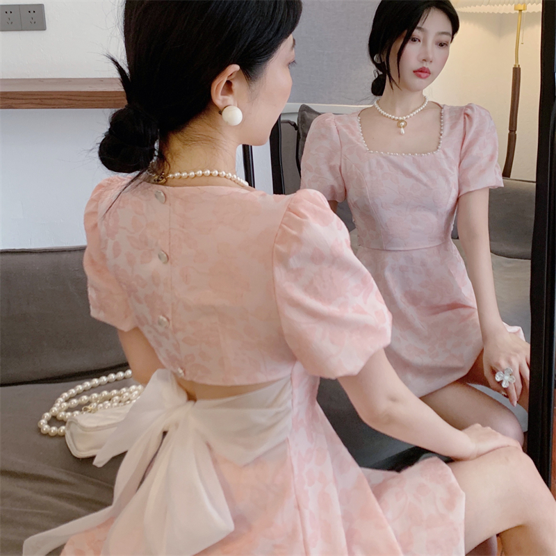 BY12489# 法式复古珍珠方领连衣裙蓬松露背系带蝴蝶结收腰气质裙子 服裝批發女裝批發服飾貨源