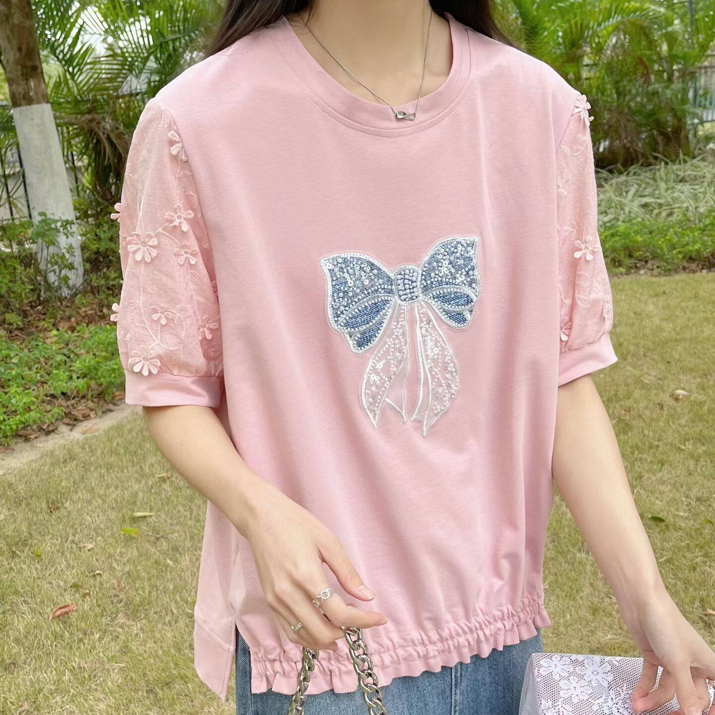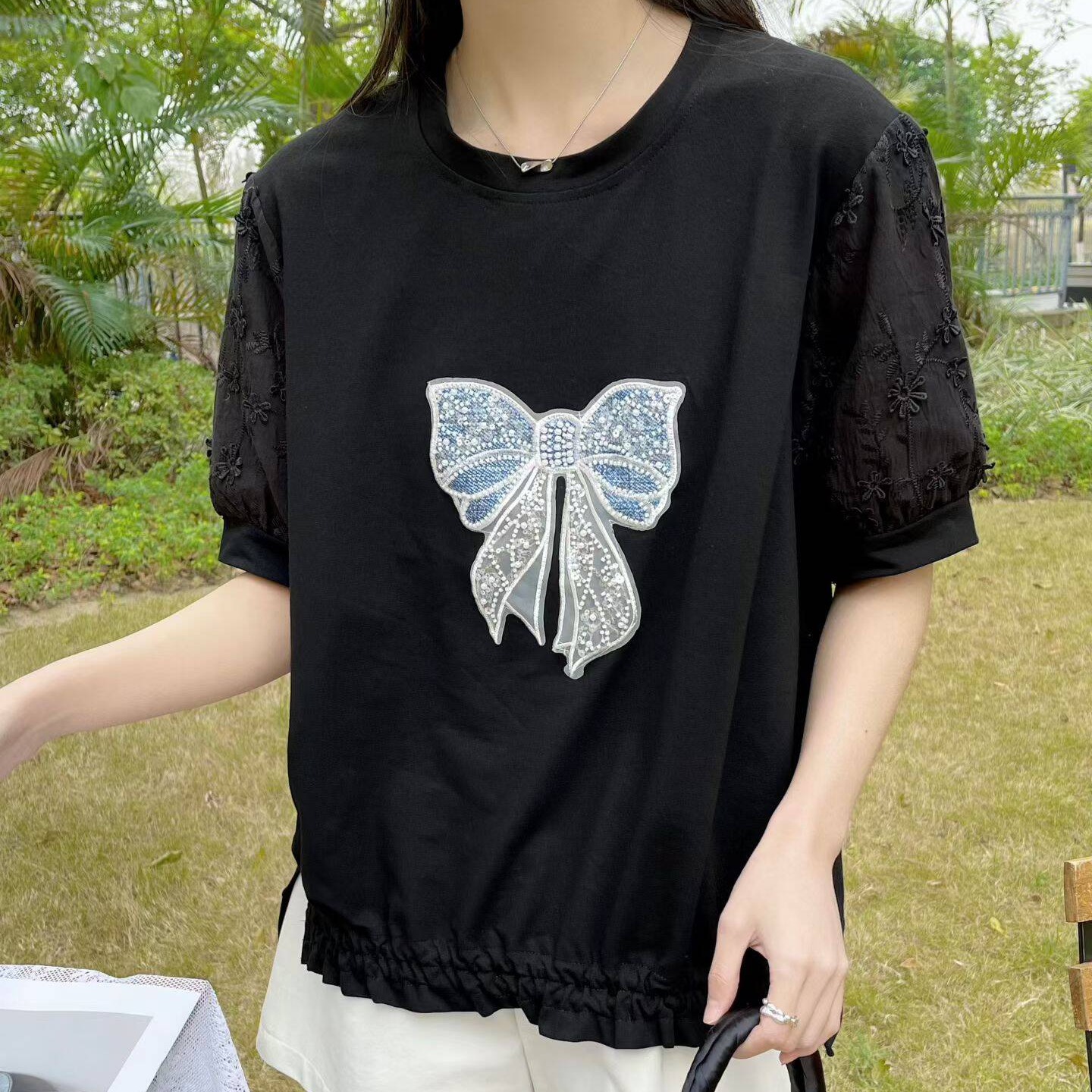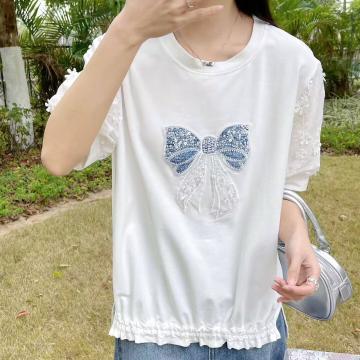 BY12502# 白色蝴蝶结重工钉珠短袖T恤女春夏欧货时尚百搭款设计感纯棉上衣 服裝批發女裝批發服飾貨源