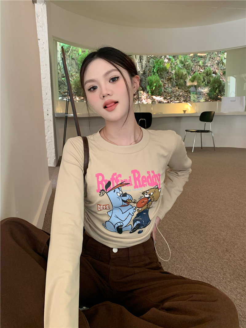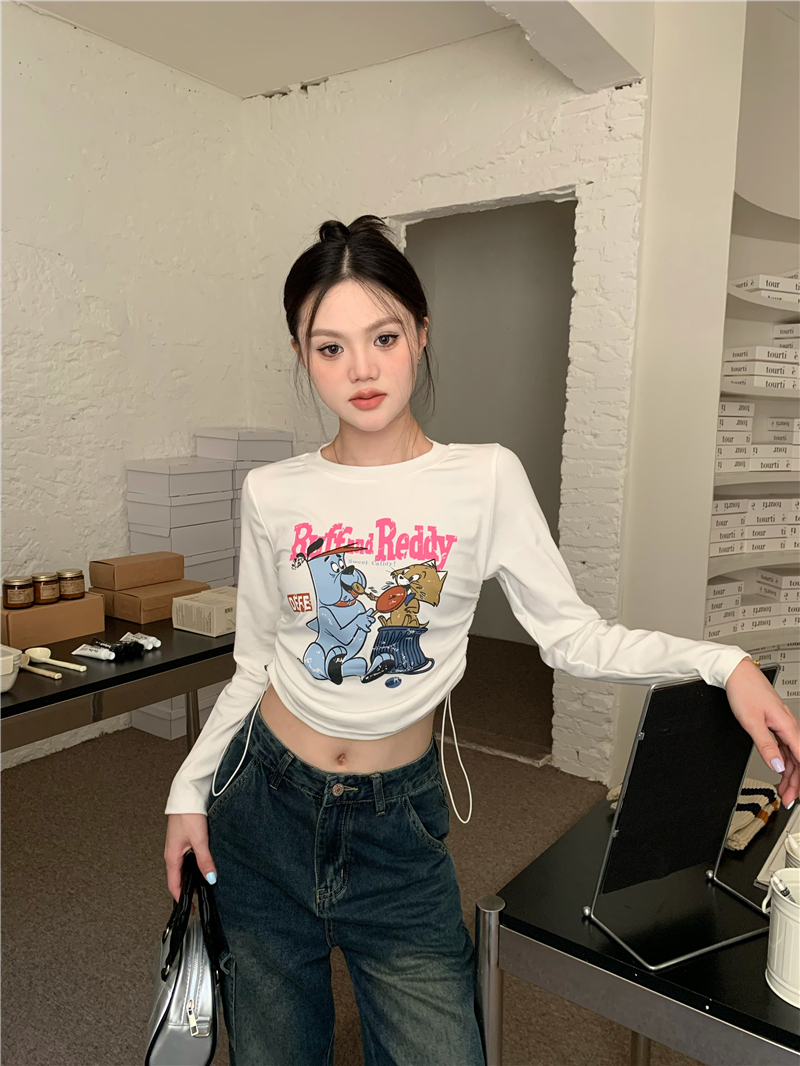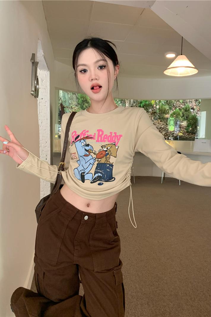 BY12513# 美式复古卡通印花抽绳短款长袖上衣 服裝批發女裝批發服飾貨源