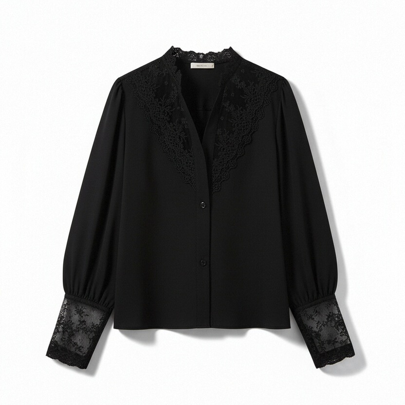 BY12528# 蕾丝拼接polo领衬衫外套女春秋长袖宽松百搭衬衣气 服裝批發女裝批發服飾貨源