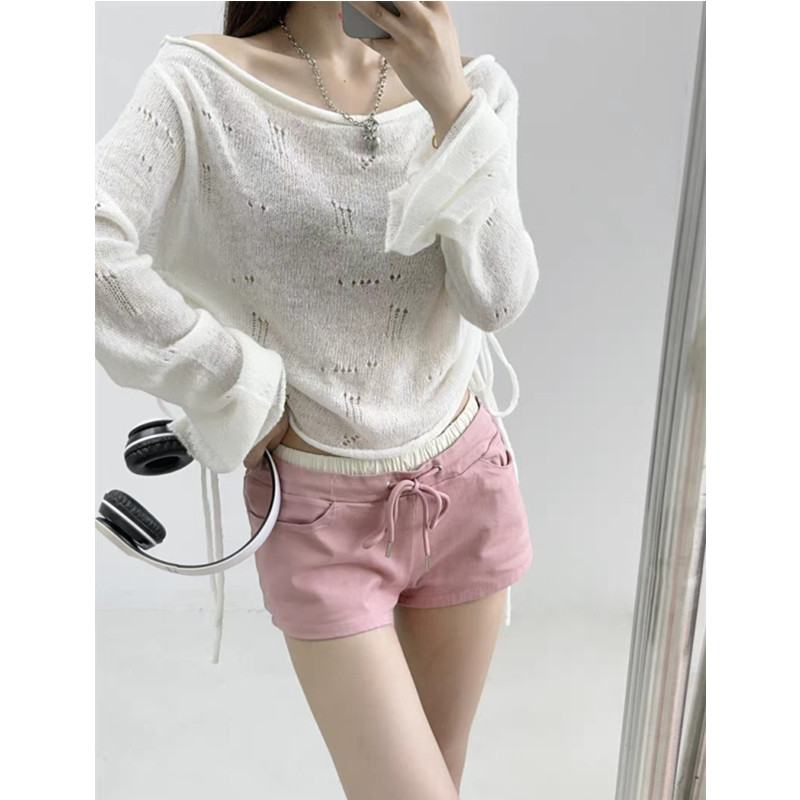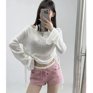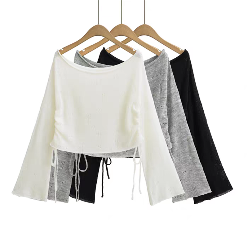 BY12970# 新款薄款一字肩针织衫辣妹宽松短款抽绳绑带喇叭长袖上衣防晒罩衫 服裝批發女裝批發服飾貨源