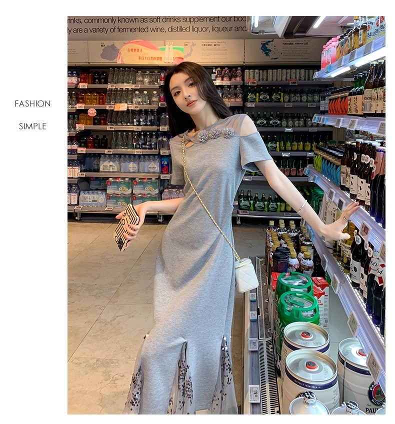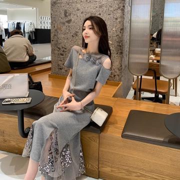 BY13002# 灰色法式露肩连衣裙女夏季显瘦减龄超好看独特漂亮高级感裙子 服裝批發女裝批發服飾貨源