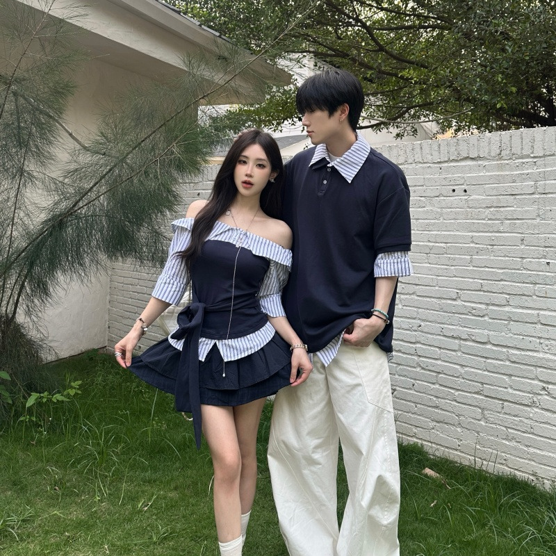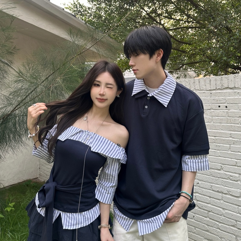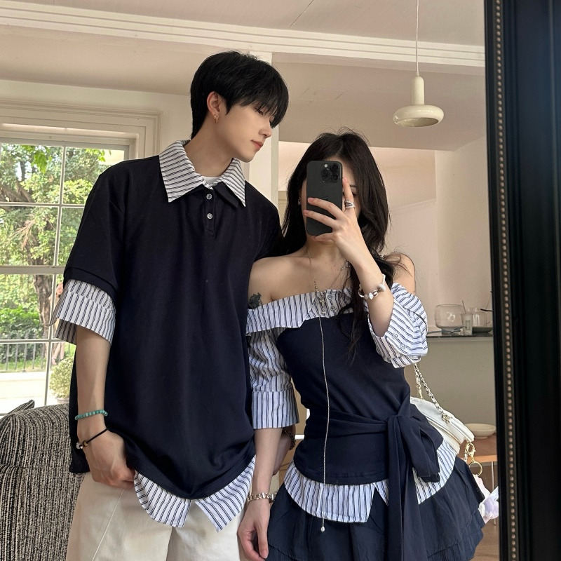 BY14299# 情侣休闲拼接假两件条纹短袖男女T恤 服裝批發女裝批發服飾貨源