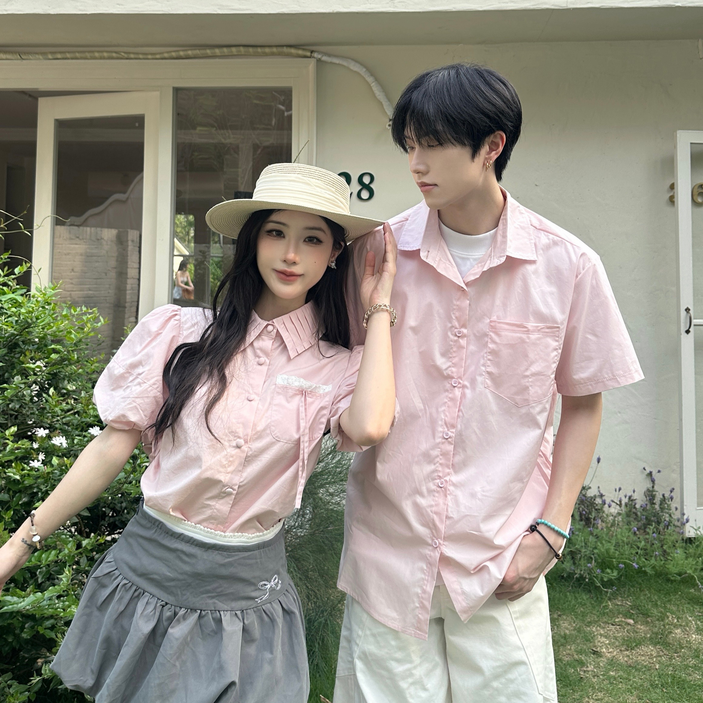 BY14300# 情侣夏季粉色男女短袖日系衬衫 服裝批發女裝批發服飾貨源
