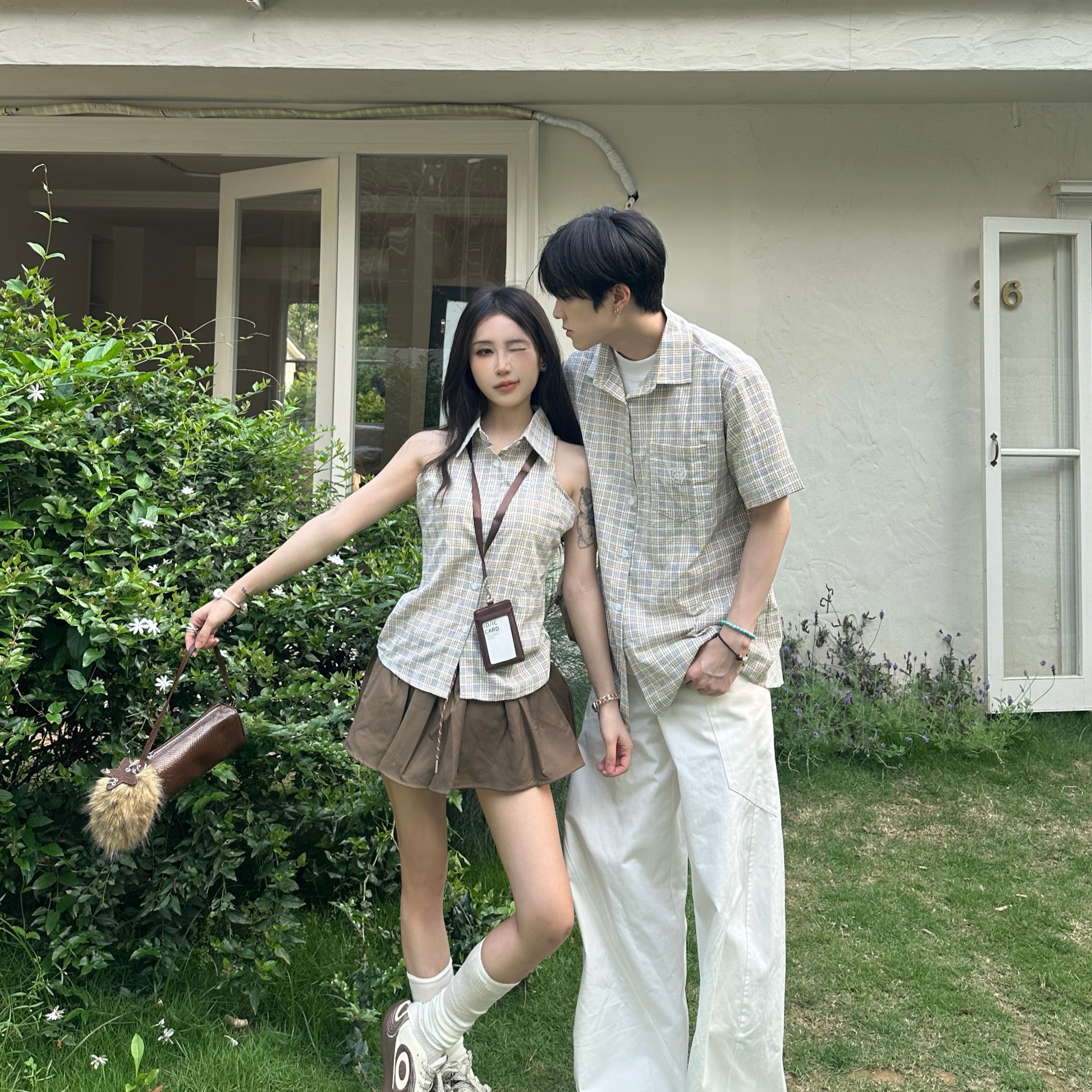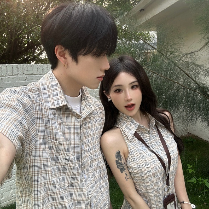 BY14301# 情侣校园风夏季短袖衬衫男女格子 服裝批發女裝批發服飾貨源