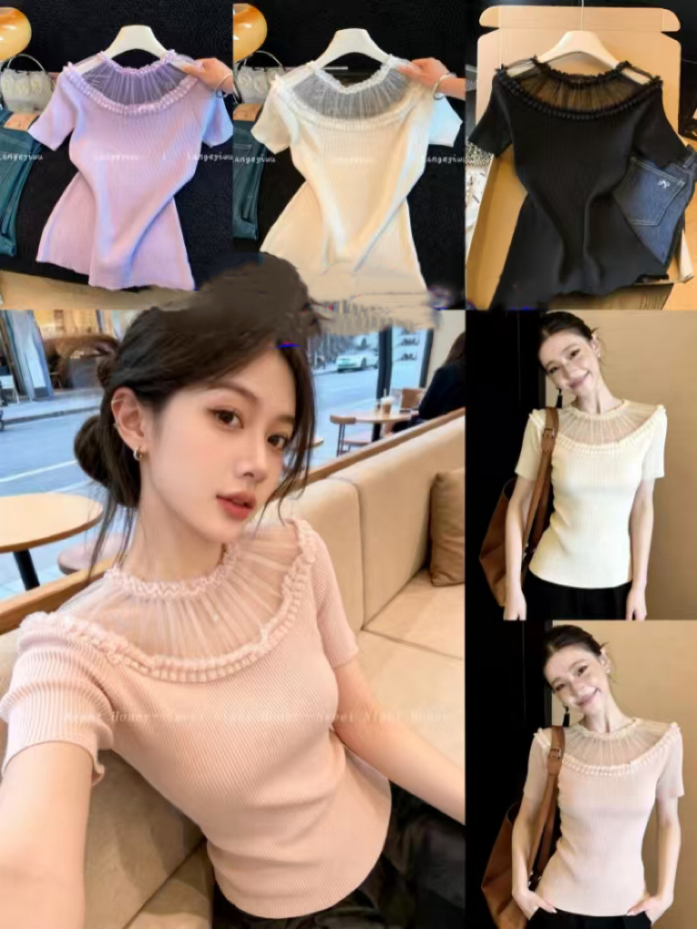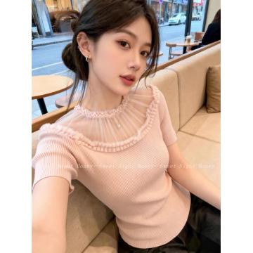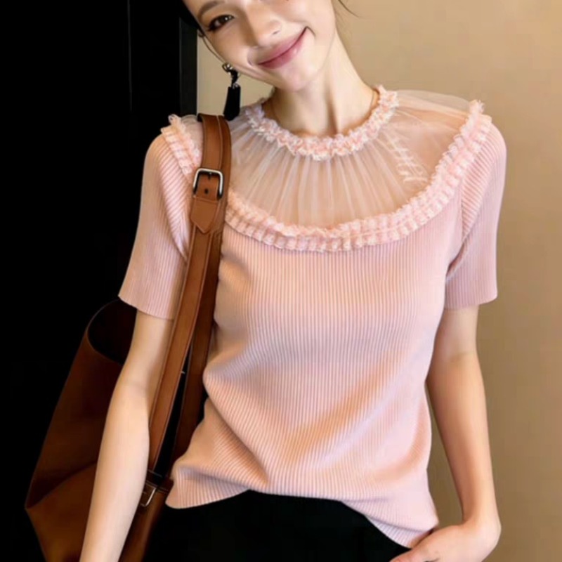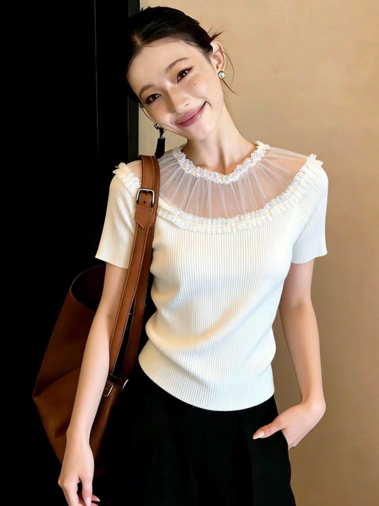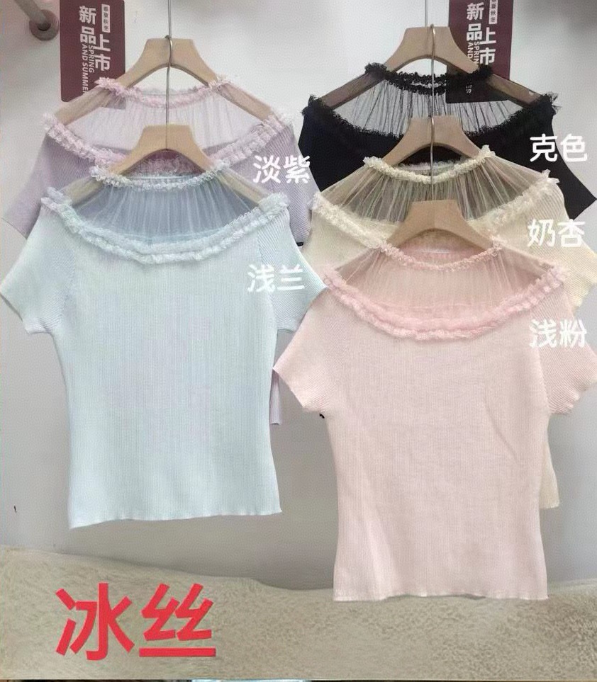 BY14465# 夏季新款温柔风蕾丝花边圆领短袖针织衫女修身气质减龄T恤上衣女服裝批發女裝批發服飾貨源