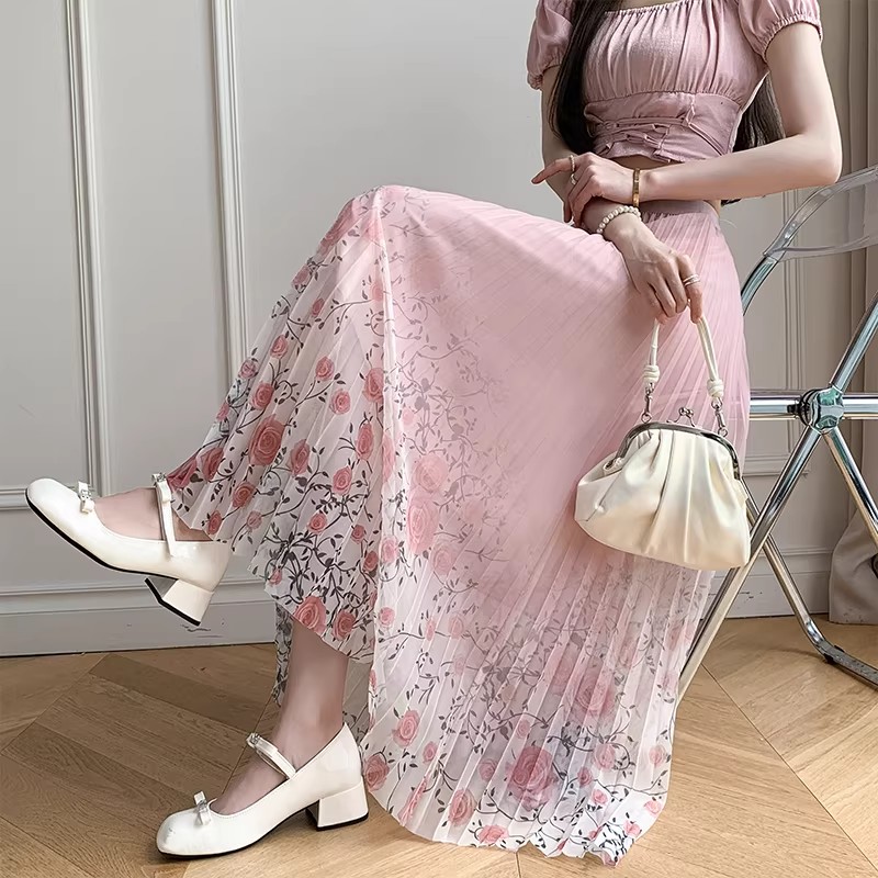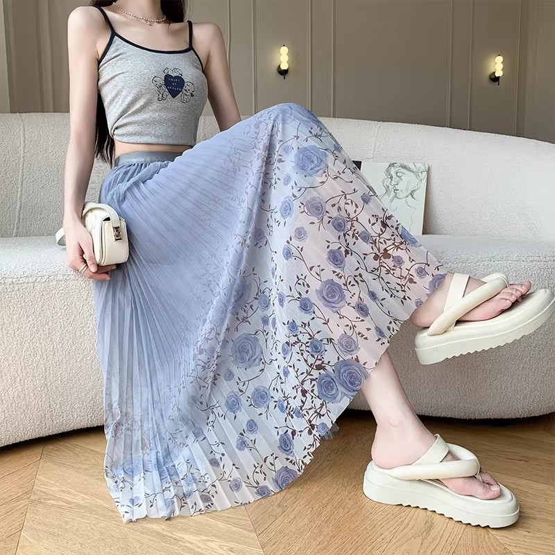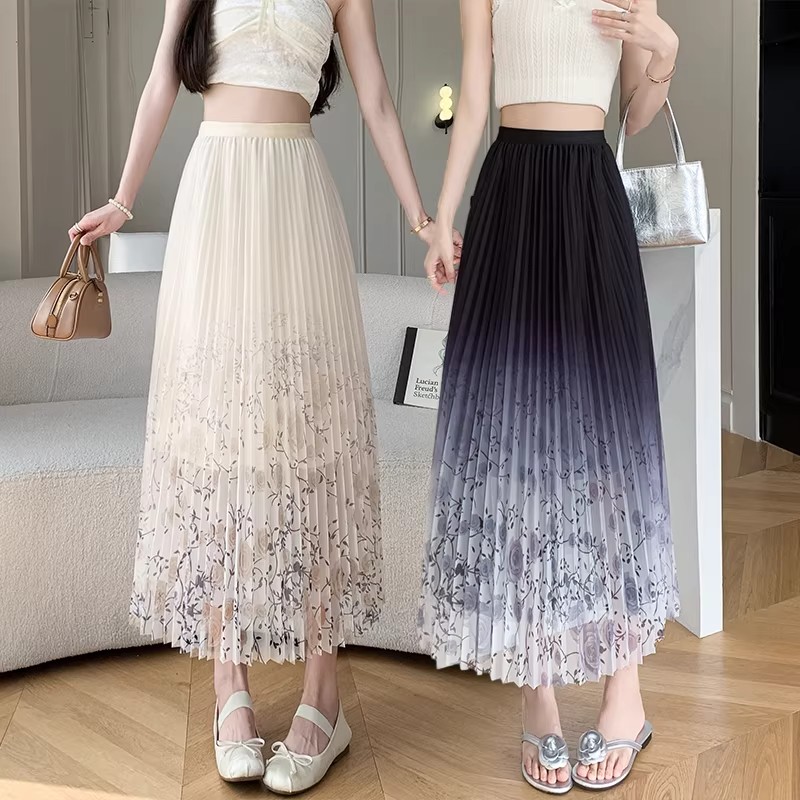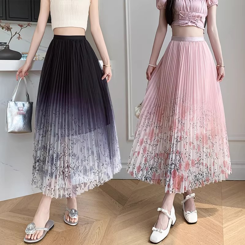 BY14472# 网纱半身裙女印花小清新夏季新款显瘦碎花A字大摆百褶裙纱裙服裝批發女裝批發服飾貨源