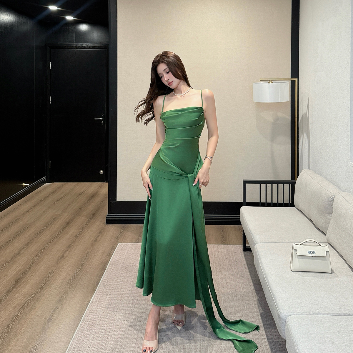 BY14829# 睡莲法式缎面吊带绿色连衣裙女修身方领海边度假礼服 服裝批發女裝批發服飾貨源
