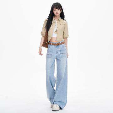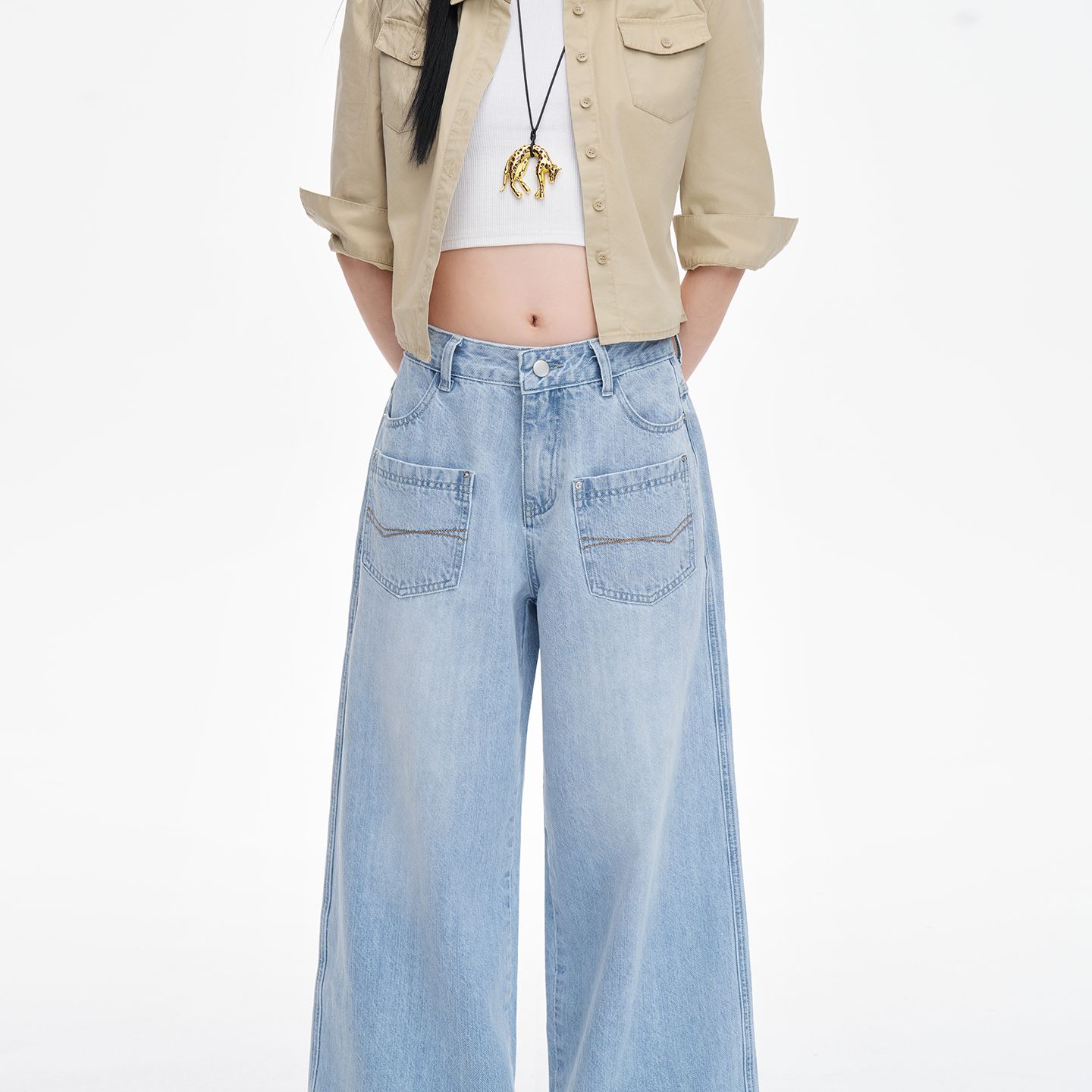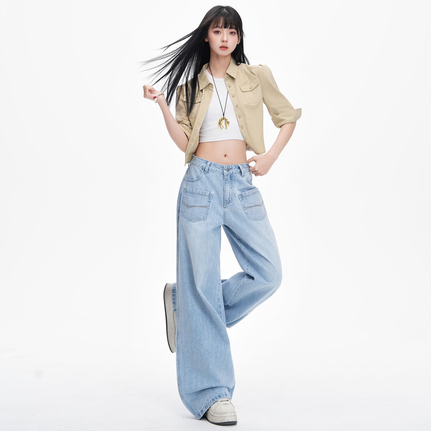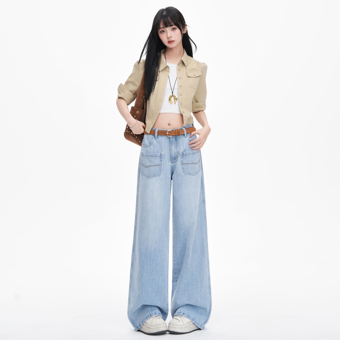 BY14847# 浅蓝阔腿牛仔裤春季新款双口袋高腰宽松显瘦百搭拖地裤 服裝批發女裝批發服飾貨源