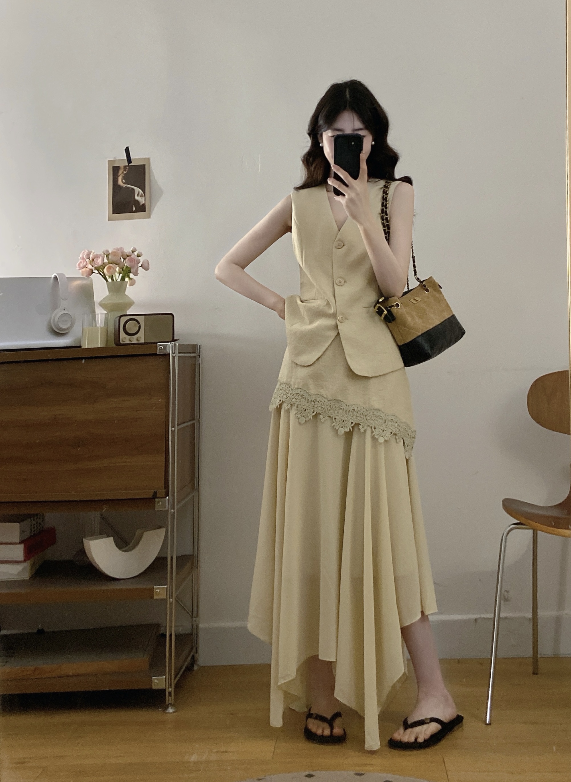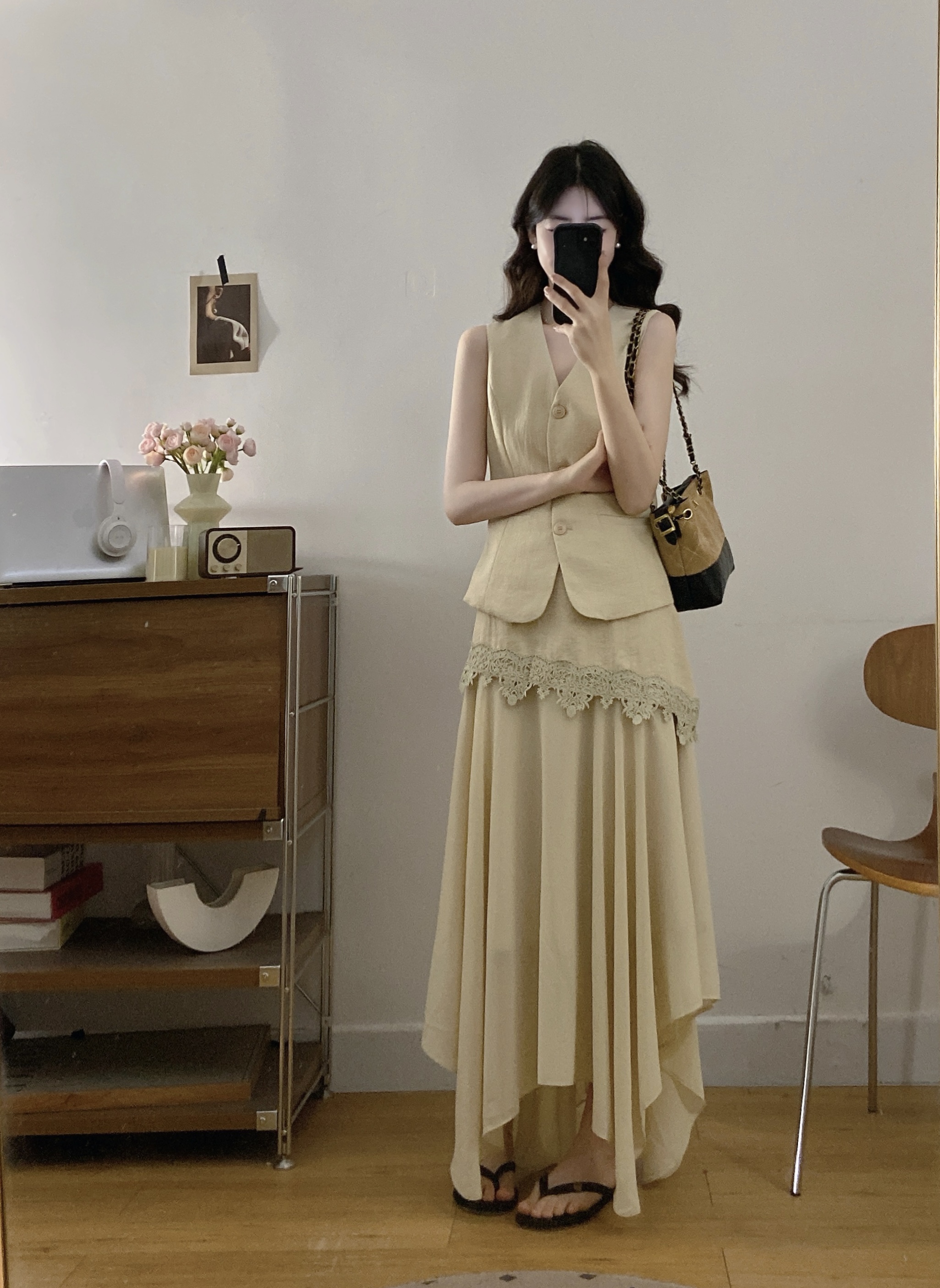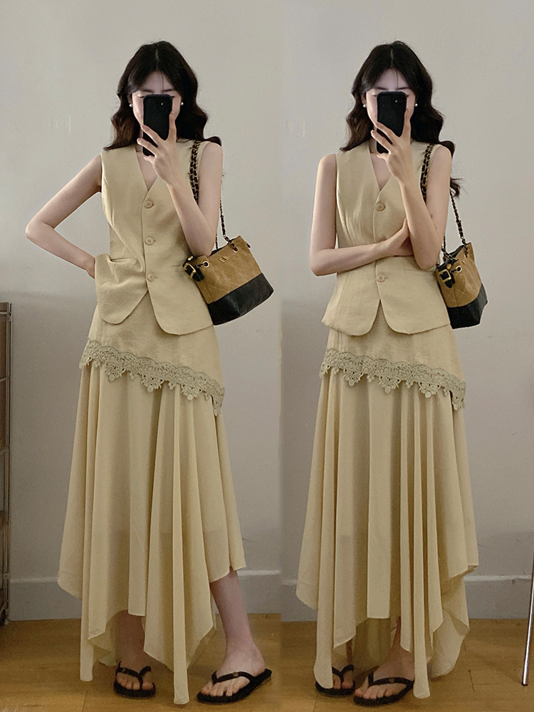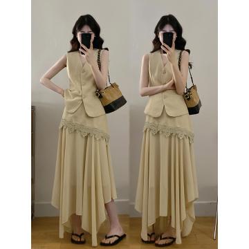大码女装夏新款轻熟风西装马甲蕾丝拼接半身裙两件套