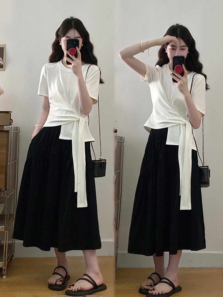 BY16817# 大码女装夏季新款韩版不规则收腰上衣黑色半身裙两件套