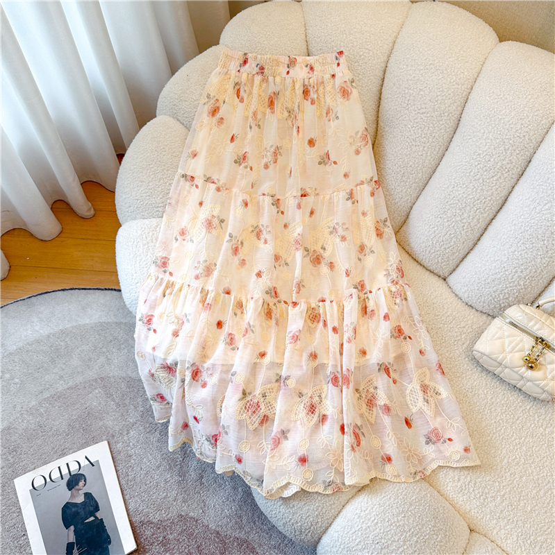 BY18740# 重工刺绣碎花百褶裙半身裙女夏季显瘦垂感a字伞裙长款大摆裙 服裝批發女裝批發服飾貨源