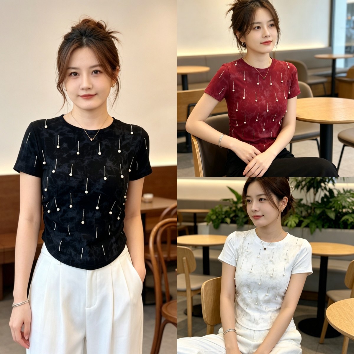 Home > 短袖T恤 > BY18757# 夏季新款正肩圆领烫钻短袖女收腰时尚百搭爆款上衣潮 服裝批發女裝批發服飾貨源
