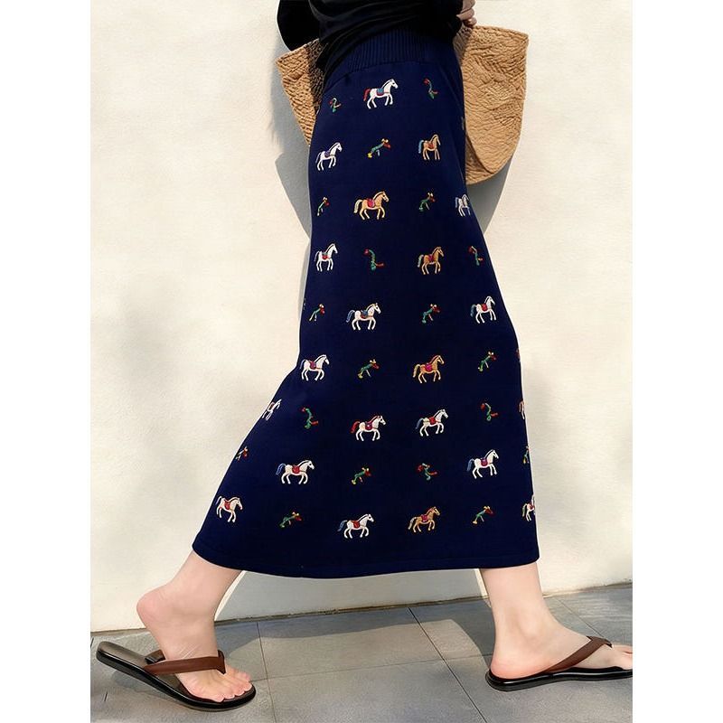 BY18779# 高级感独特漂亮卡通小马半身裙女丝绒春季新款高腰直筒a字中长裙 服裝批發女裝批發服飾貨源