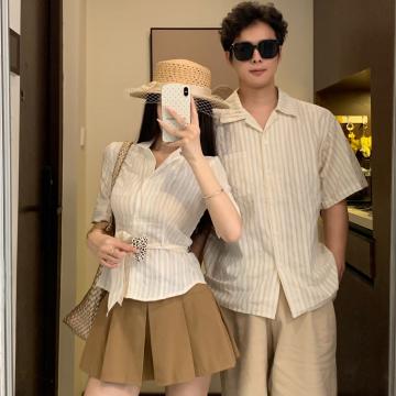 BY19026# 情侣装夏季设计感韩系简约系带V领收腰衬衫 服裝批發女裝批發服飾貨源