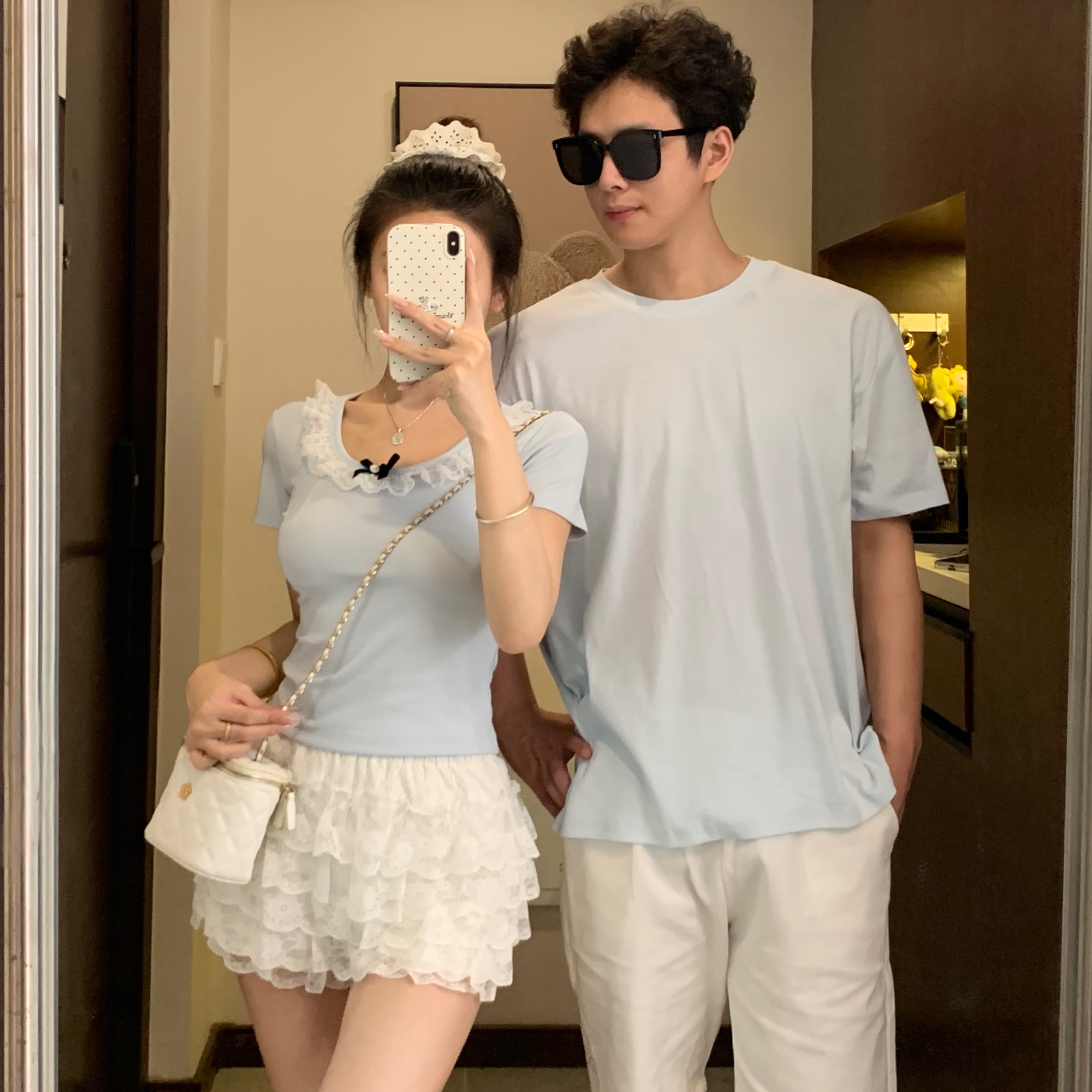 BY19028# 情侣装夏季芭蕾风蕾丝拼接baby蓝正肩短袖T恤女 服裝批發女裝批發服飾貨源