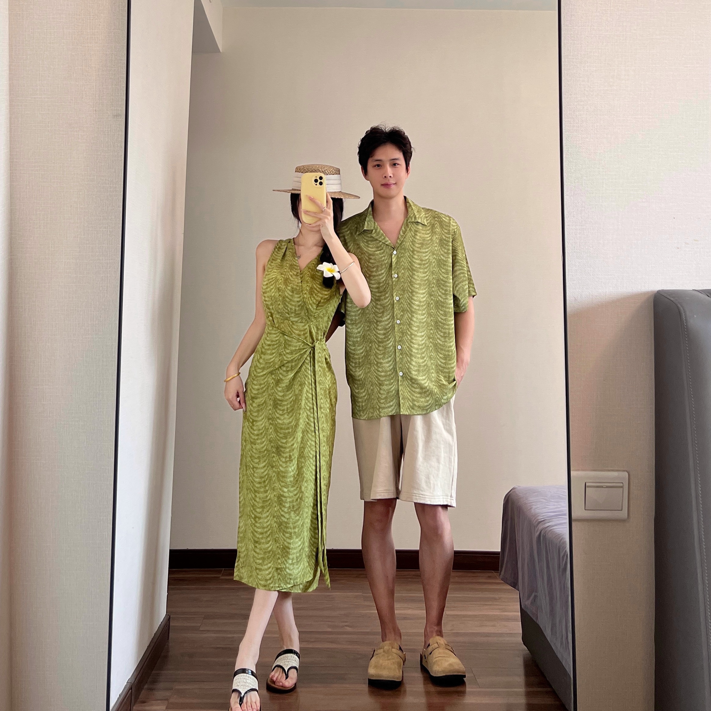 BY19032# 情侣装夏季绿色吊带裙海边度假风沙滩裙一裙一衣 服裝批發女裝批發服飾貨源