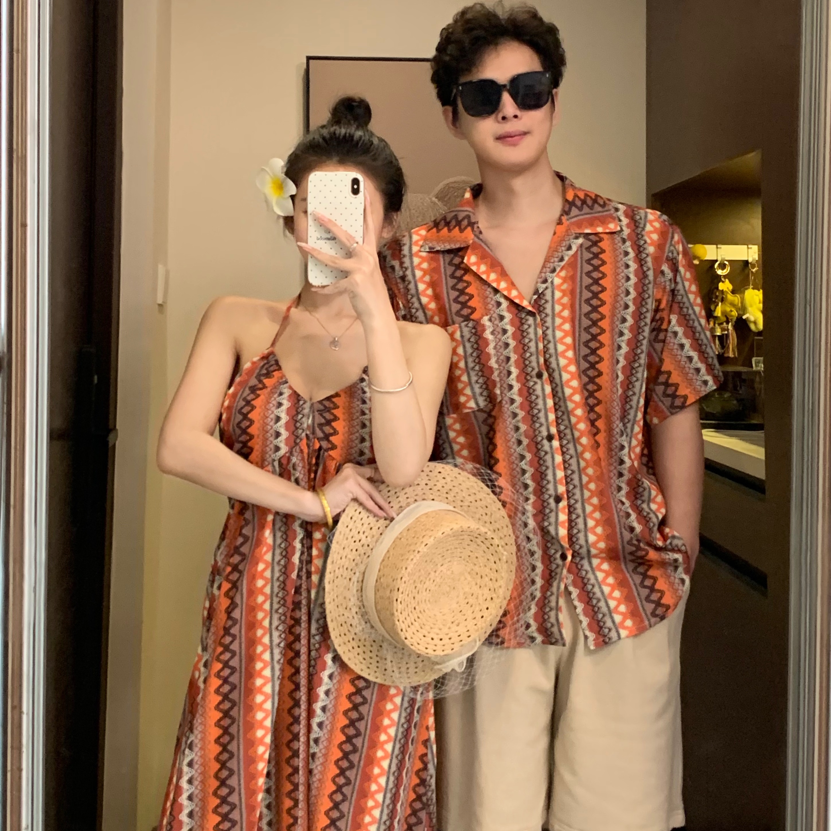 BY19039# 情侣装夏季印花吊带裙海边度假风沙滩裙一裙一衣 服裝批發女裝批發服飾貨源