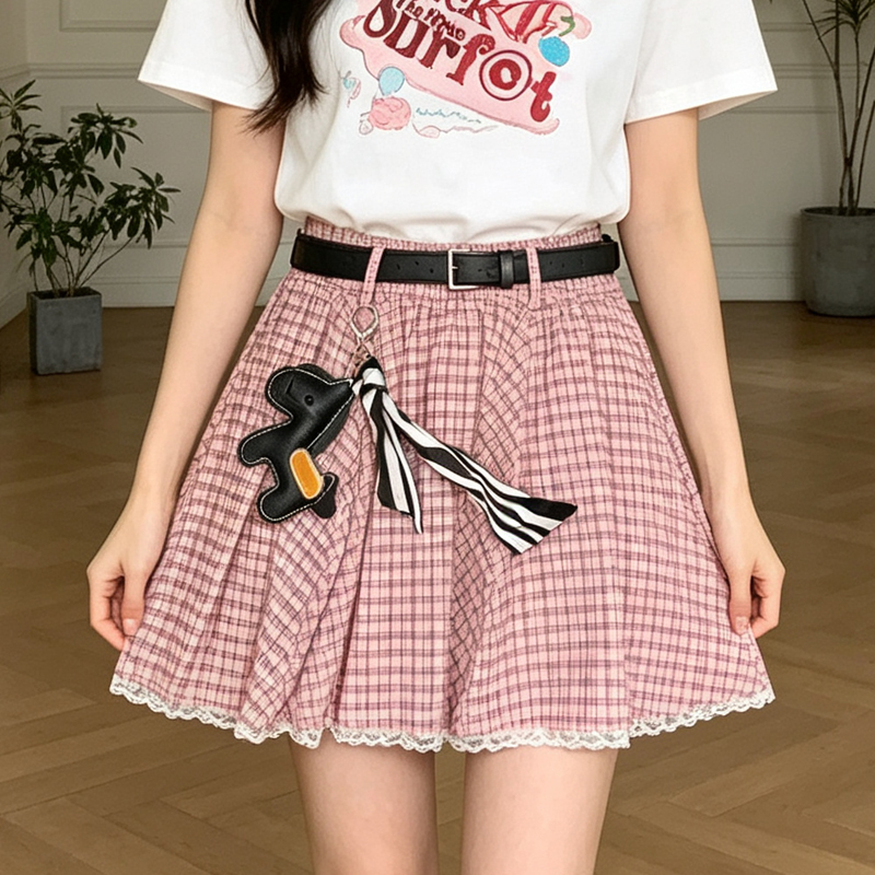 BY19077# 夏季甜妹必备绿色格子蕾丝半身裙高腰显瘦防走光A字短裙挂饰 服裝批發女裝批發服飾貨源
