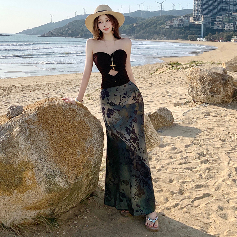 BY19117# 沙漠废土风穿搭修身高腰复古长款半身裙子辣妹抹胸背心套装 服裝批發女裝批發服飾貨源