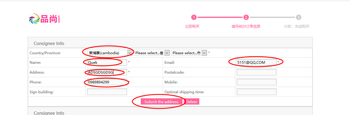 Choose the country to send, fill in the name of the goods received, the detailed address and telephone number, and the mailbox, and then click on "Submit the address“