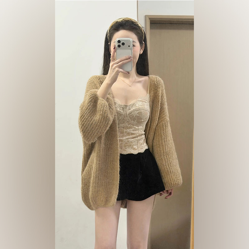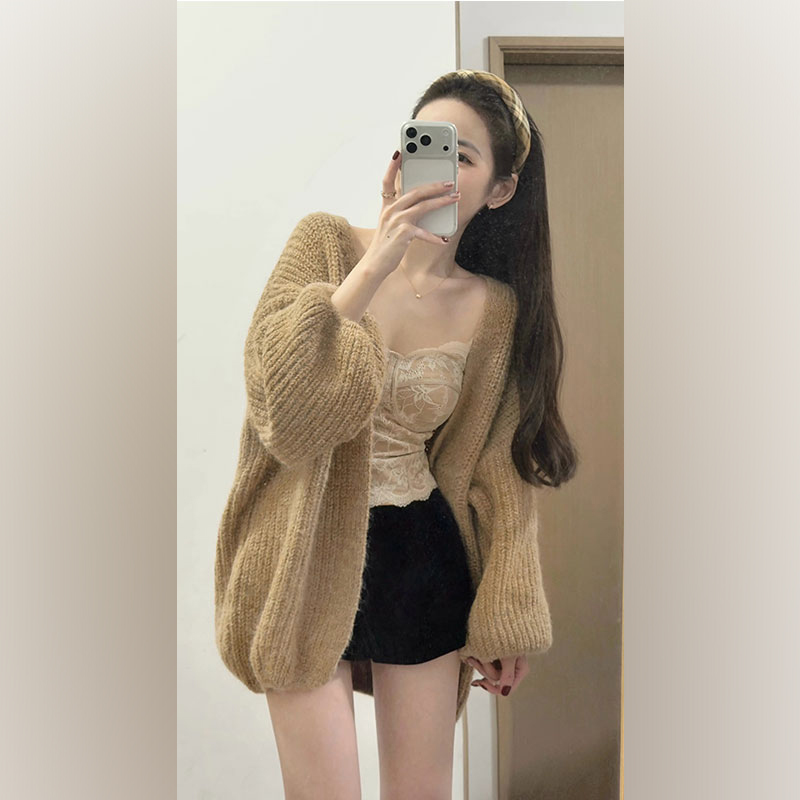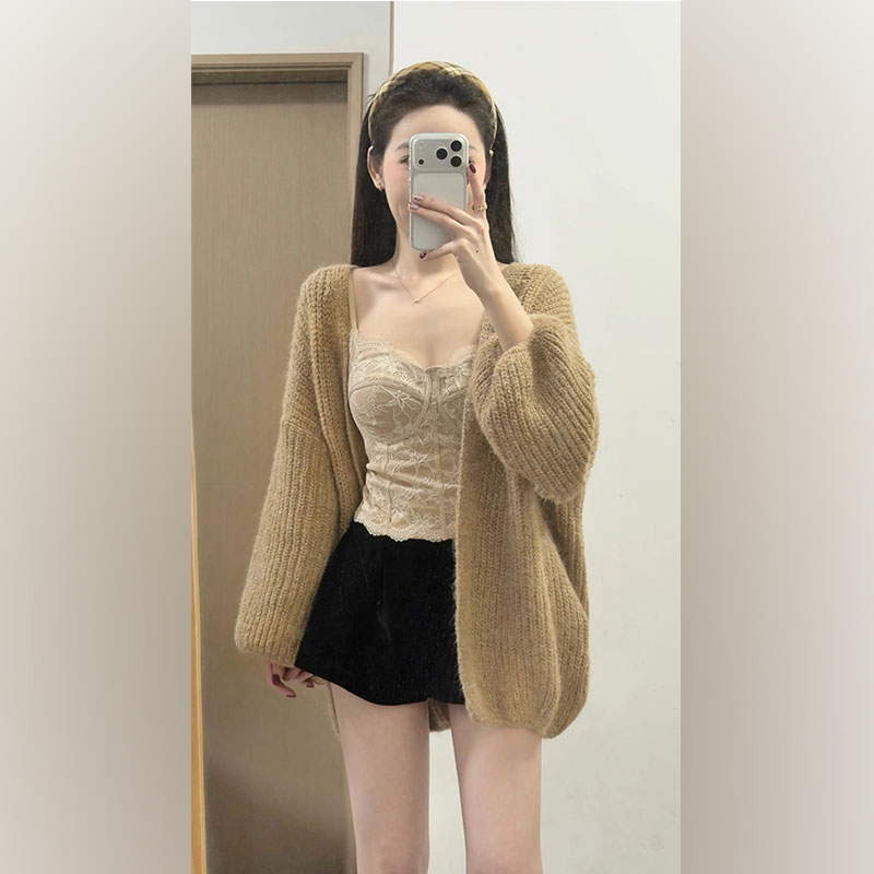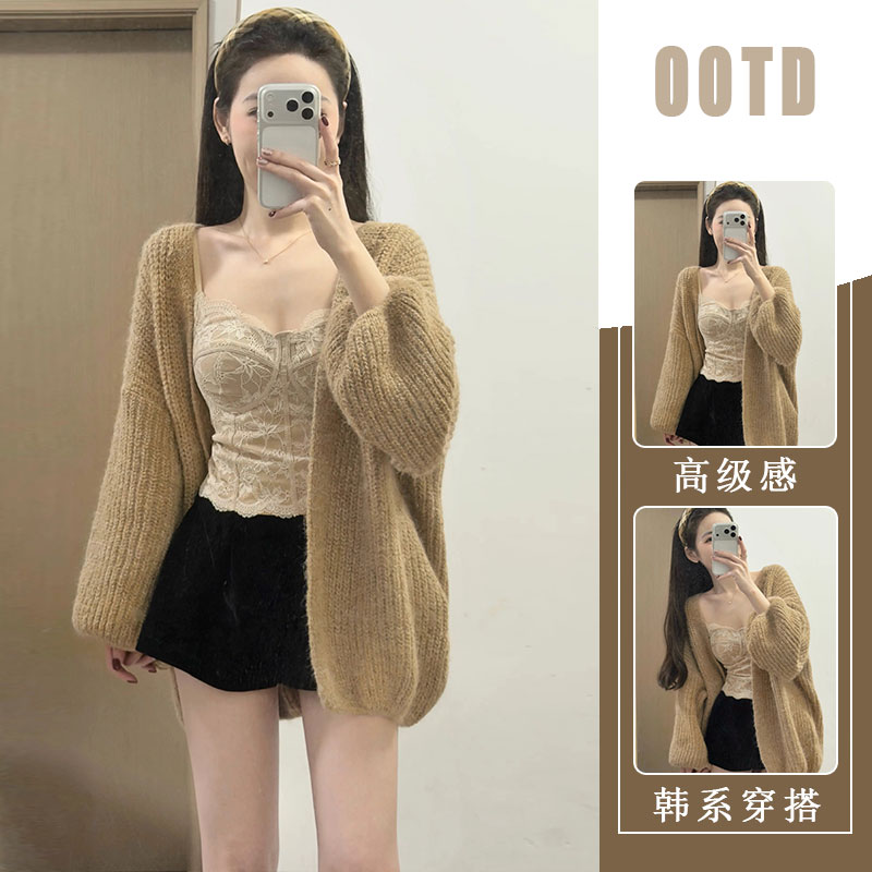 FA51658# 秋冬款美拉德慵懒感灯笼袖卡其色开衫柔软毛感外套黑色短裤两件套 服裝批發女裝批發服飾貨源