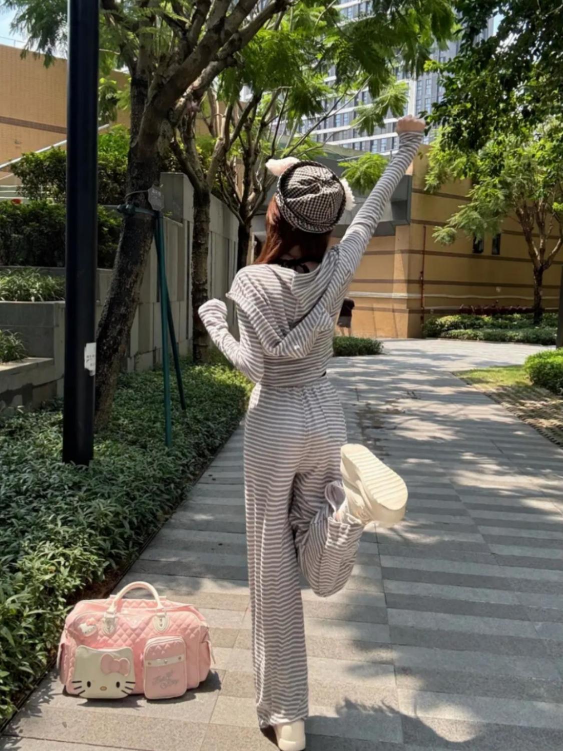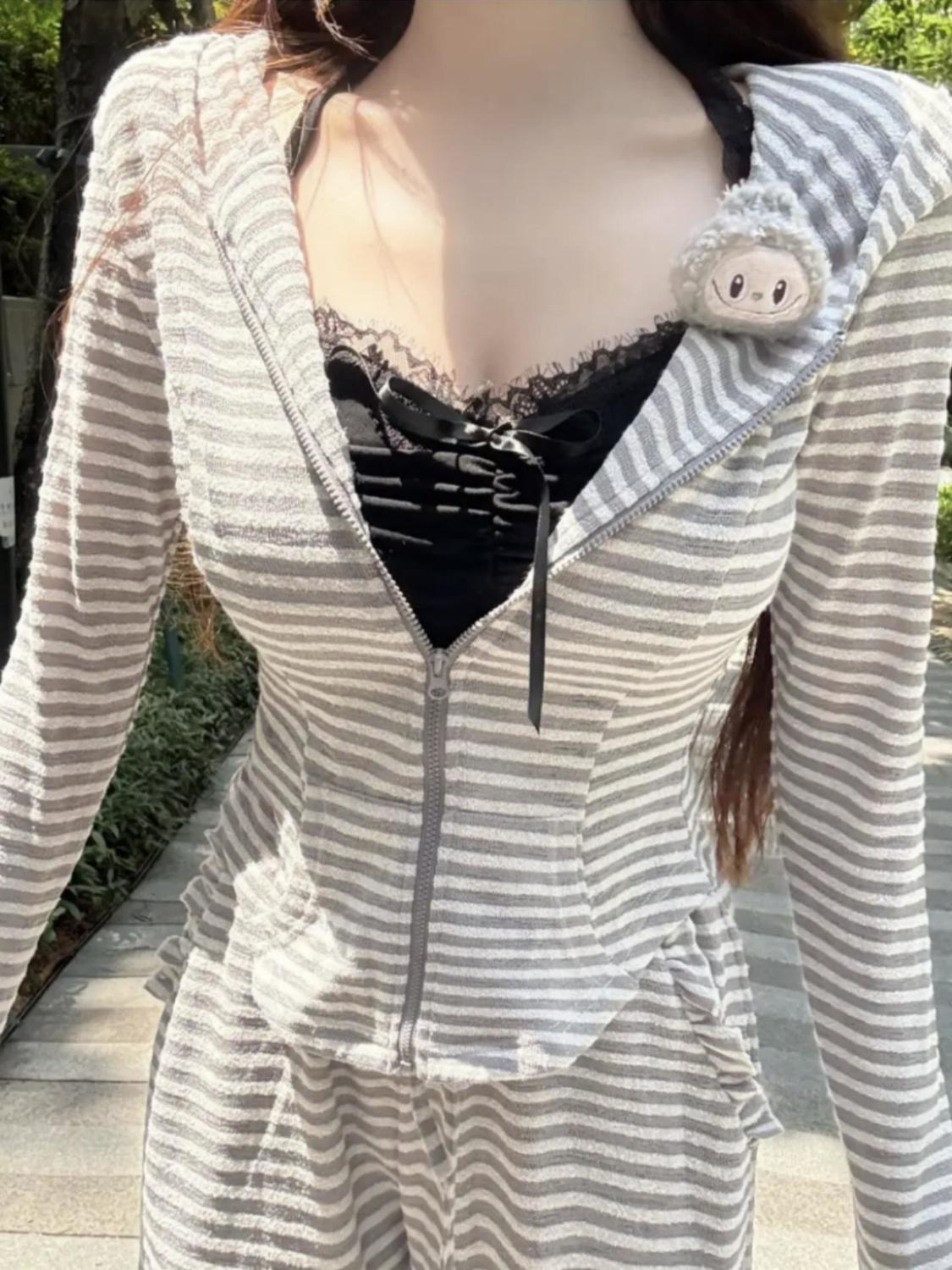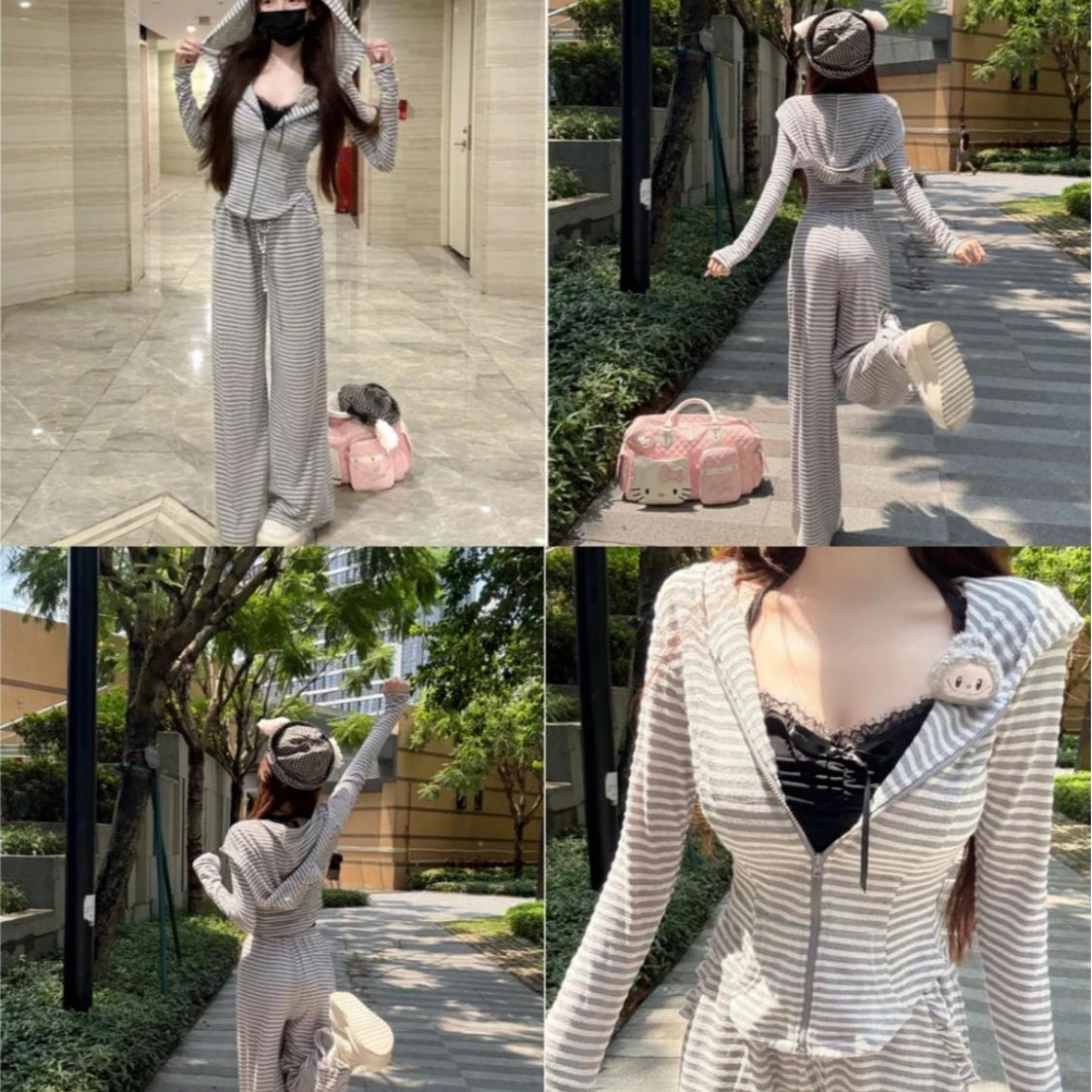 FA52048# 慵懒猫咪韩系条纹连帽开衫外套蕾丝背心穿搭阔腿长裤子一整套ins 服裝批發女裝批發服飾貨源