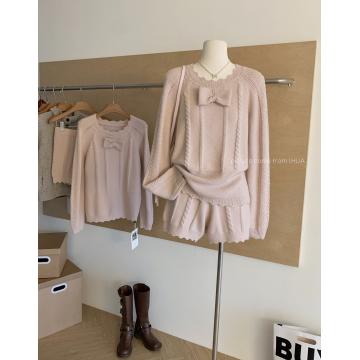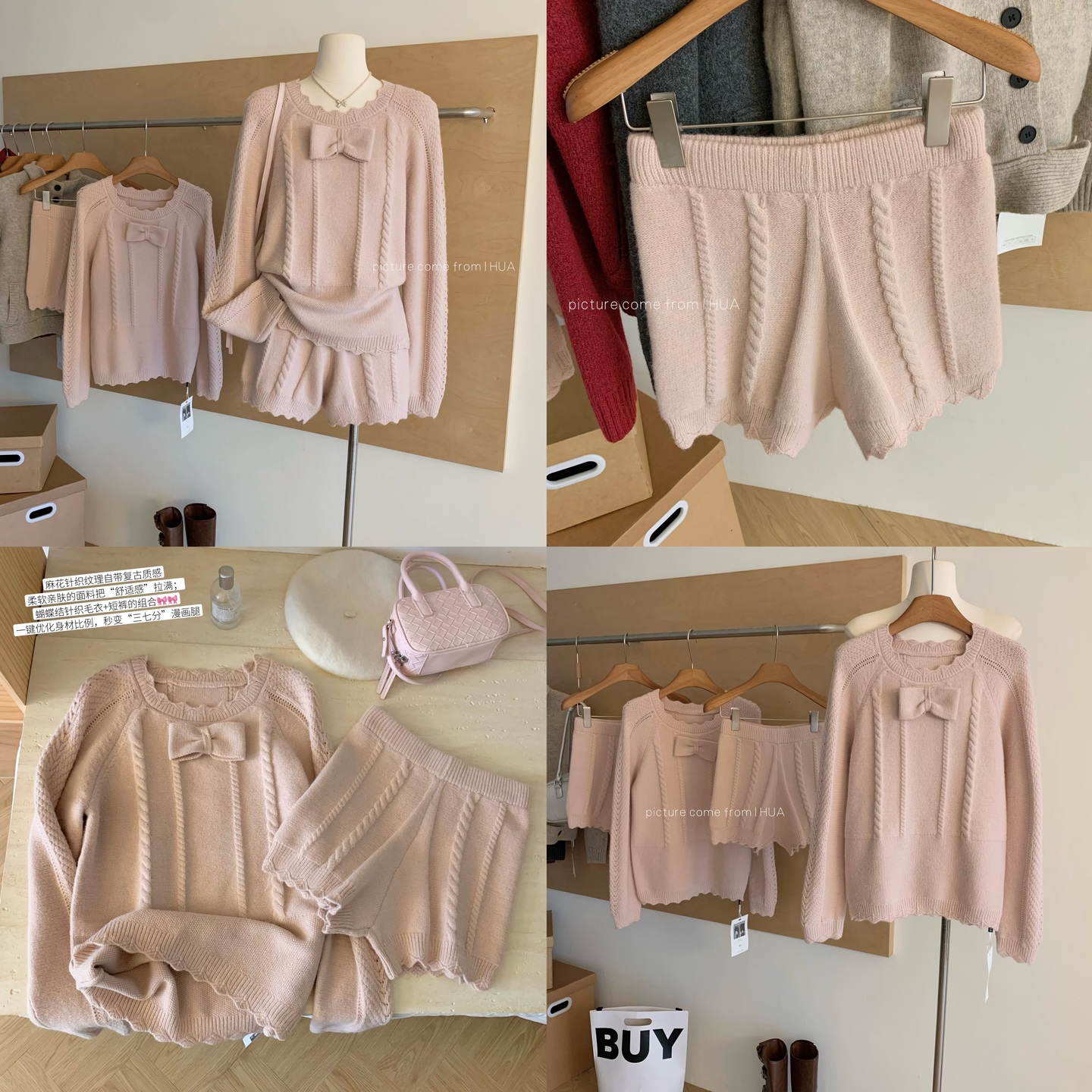 FA52132# 甜杏杏子定染纱线杏粉蝴蝶结针织上衣短裤温柔套装 服裝批發女裝批發服飾貨源