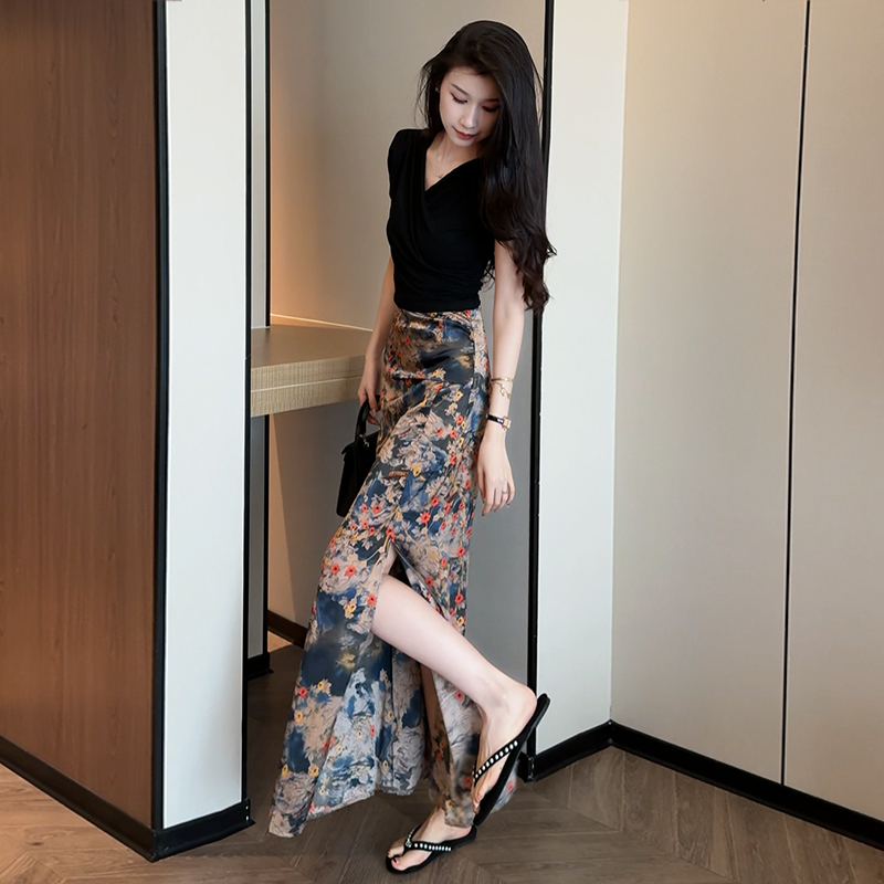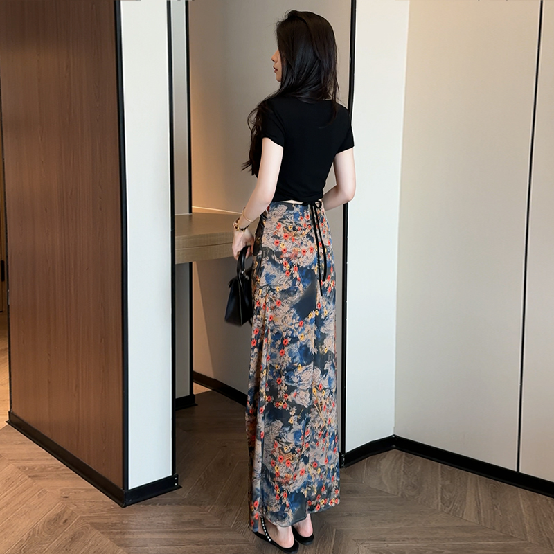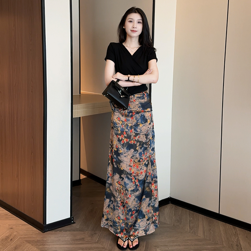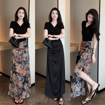 黑色上衣+花色半身裙