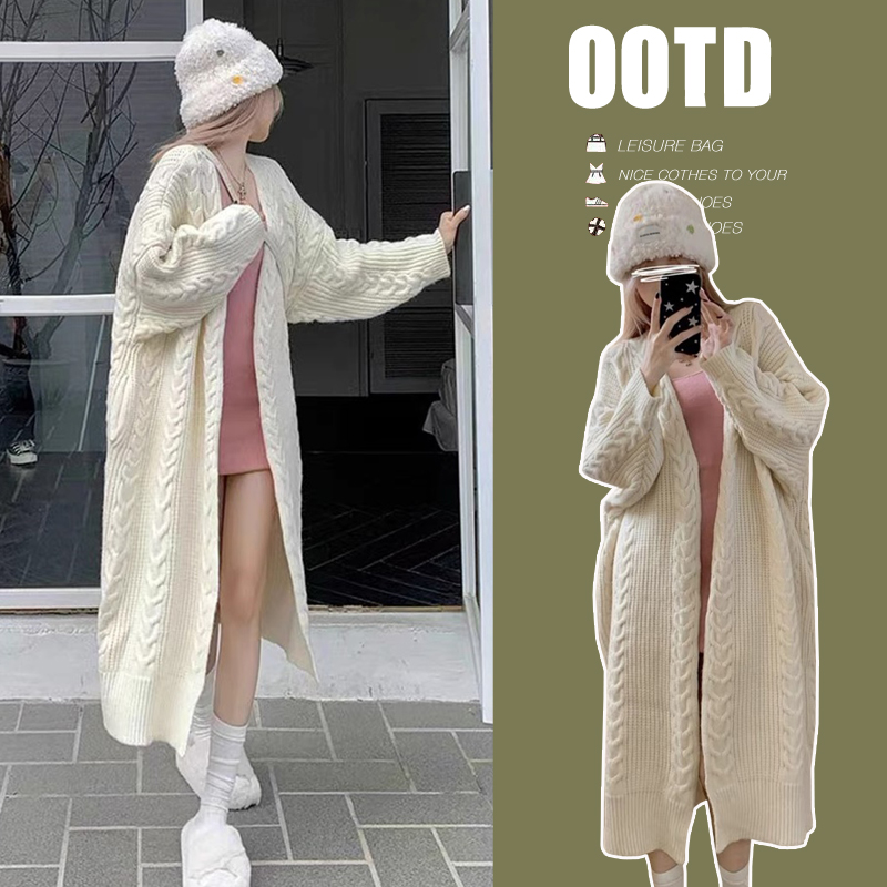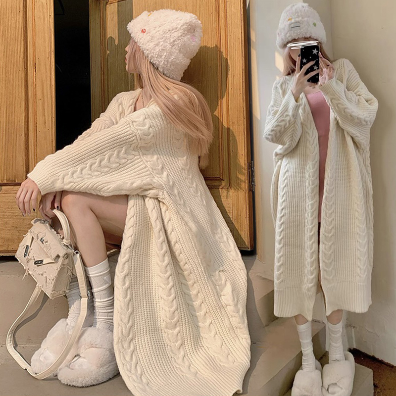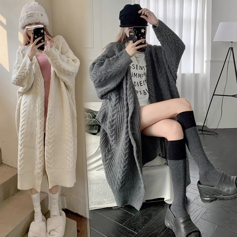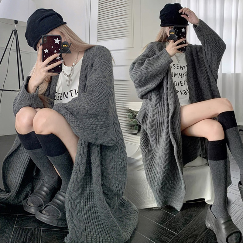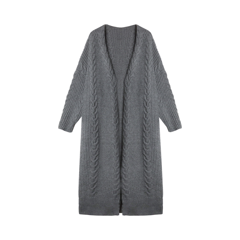 FA52185# 小众灰色麻花针织开衫女秋冬季新款慵懒风宽松中长款软糯毛衣外套 服裝批發女裝批發服飾貨源