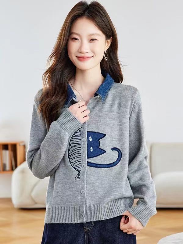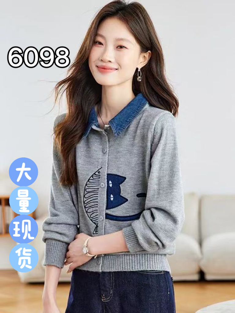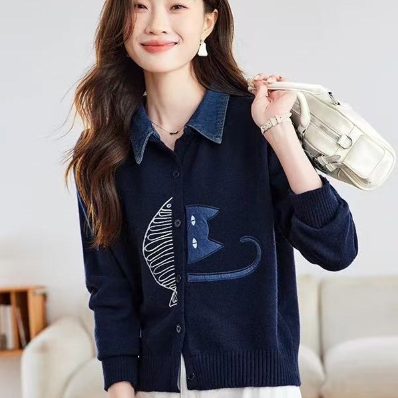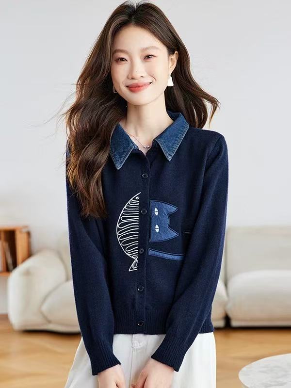 FA52534# 牛仔拼接衬衫领针织开衫女春秋新款翻领刺绣毛衣外套短款外搭 服裝批發女裝批發服飾貨源