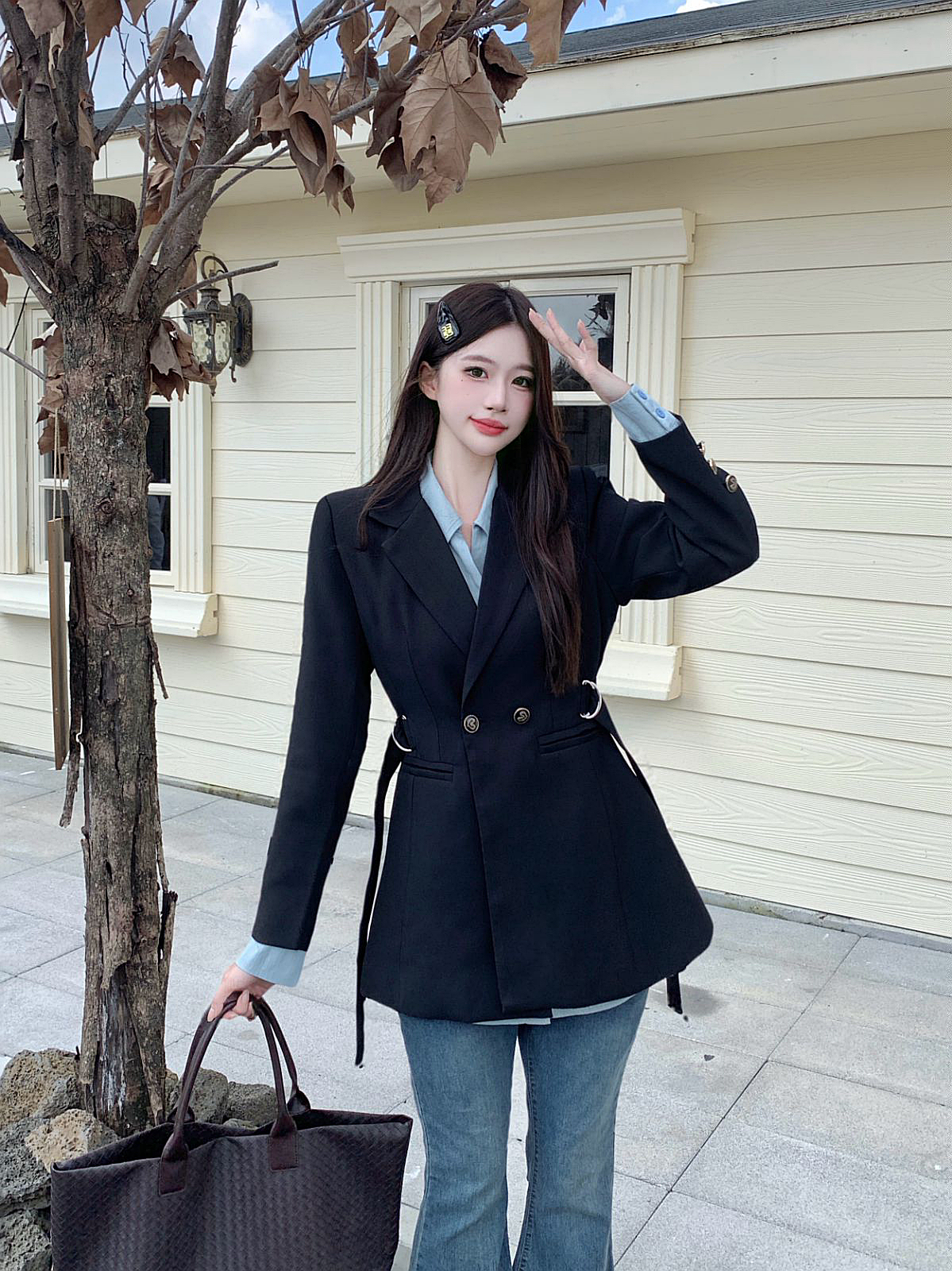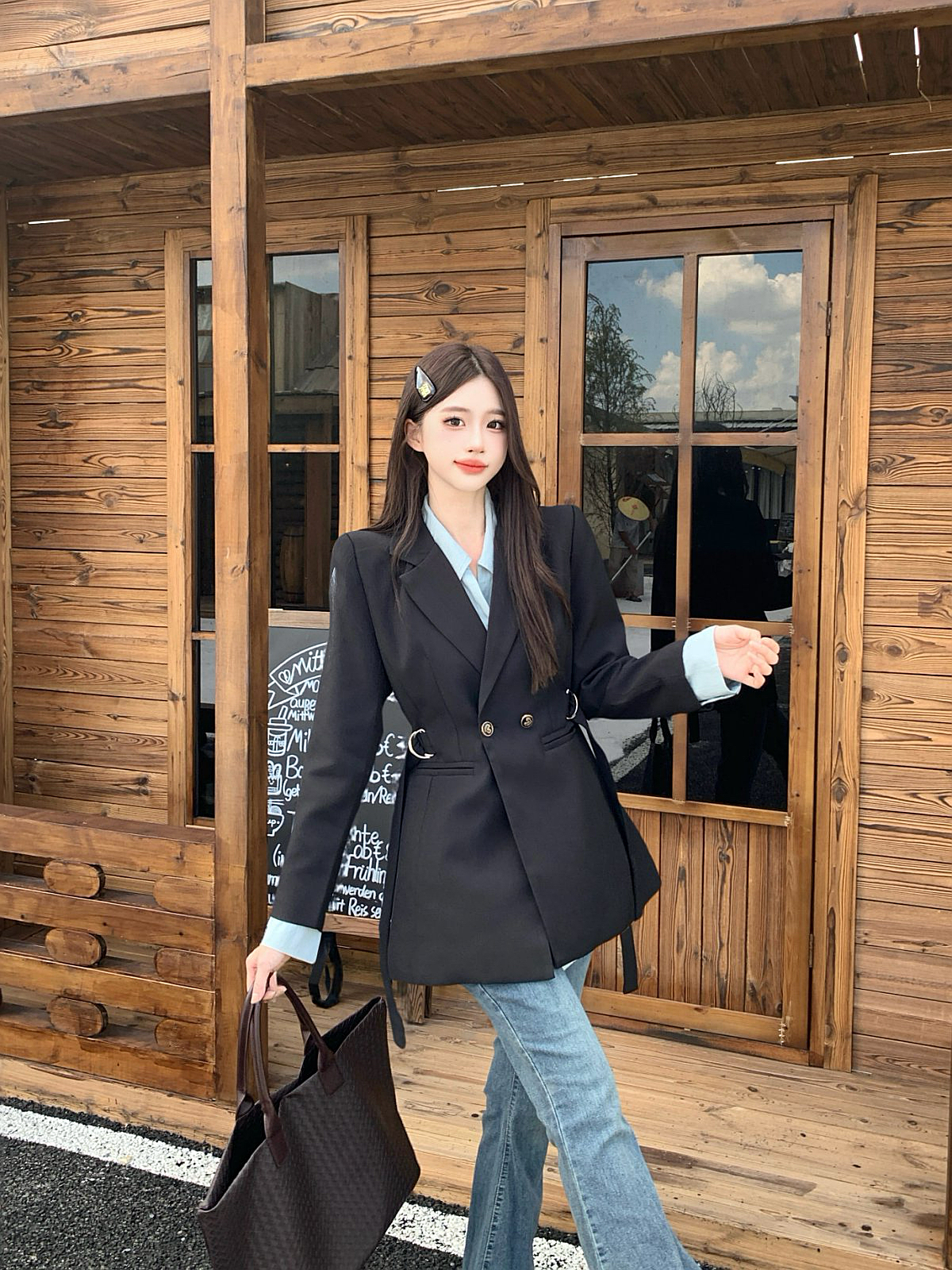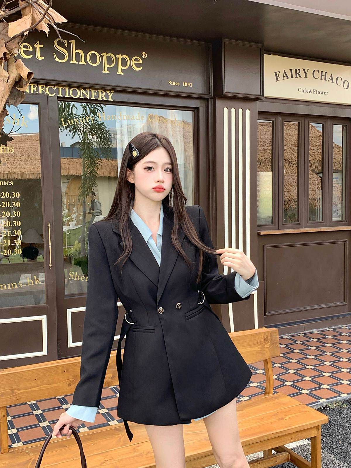 FA52769# 大码女装秋款韩版显瘦气质Polo领衬衣黑色收腰系带西装套装 服裝批發女裝批發服飾貨源