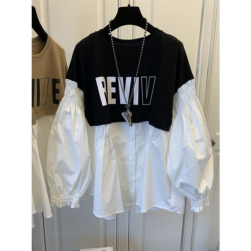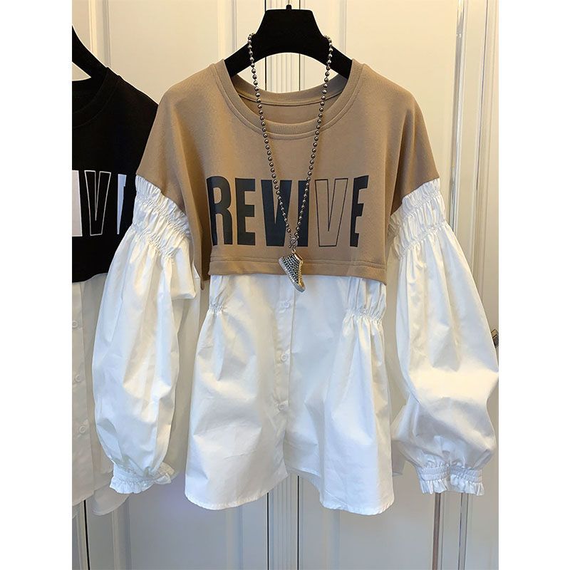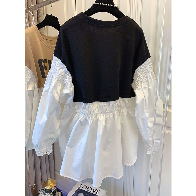 FA52781# 字母拼接撞色韩版宽松休闲娃娃款裙摆式长袖衬衫卫衣上衣女新款 服裝批發女裝批發服飾貨源
