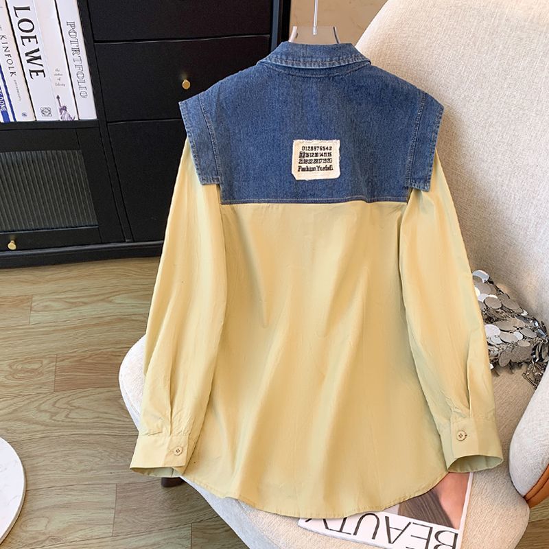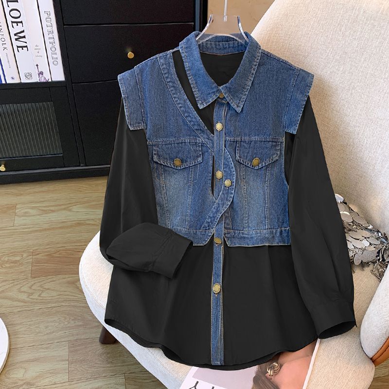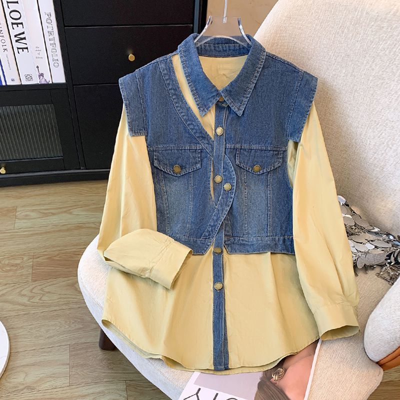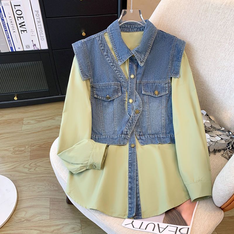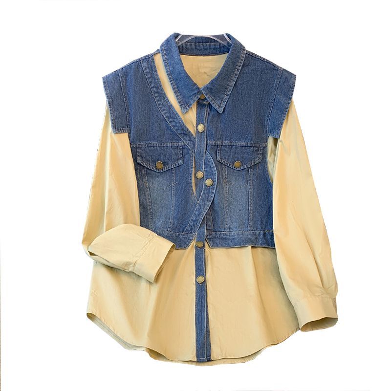 FA52786# 欧洲站春装新款时尚小众设计感不规则时尚拼接牛仔马甲衬衫女 服裝批發女裝批發服飾貨源