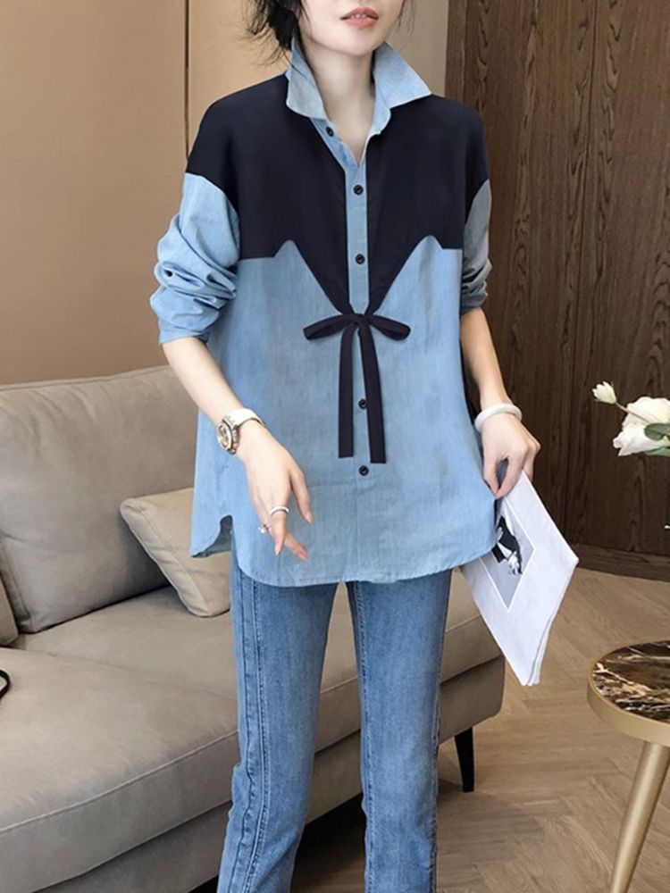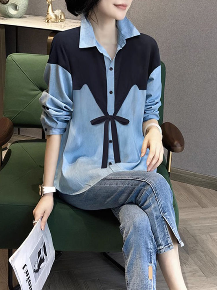FA52787# 春秋新款上衣撞色拼接长袖衬衫女宽松时尚系带洋气小衫 服裝批發女裝批發服飾貨源