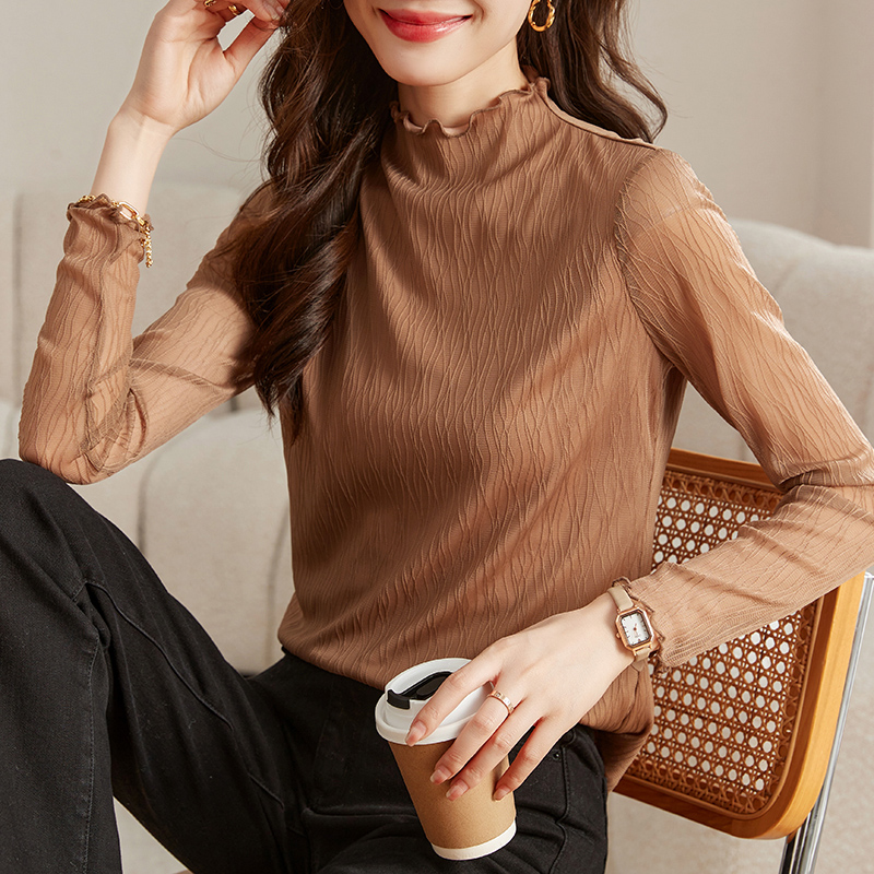 FA53049# 肌理蕾丝打底衫女早春新款花边半高领内搭长袖T恤上衣 服裝批發女裝批發服飾貨源